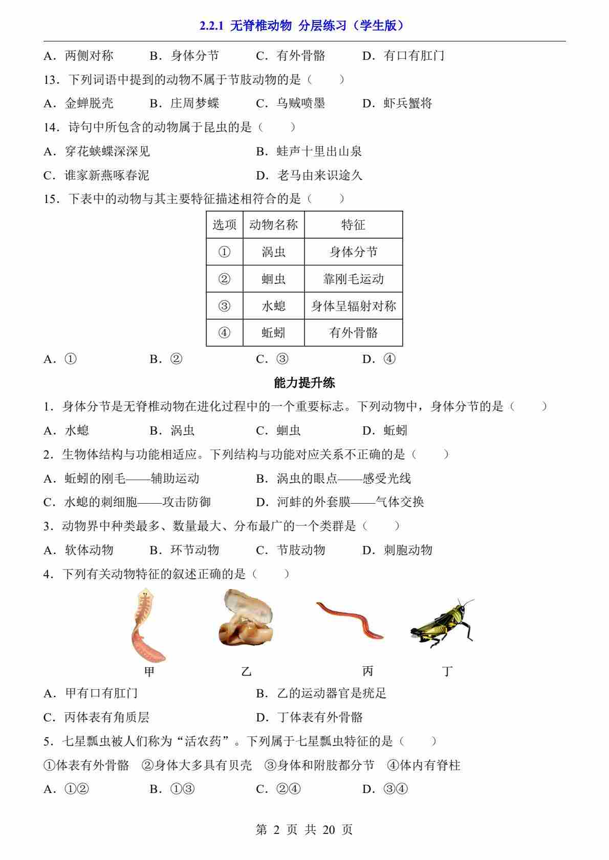 2.2.1 无脊椎动物(分层练习)