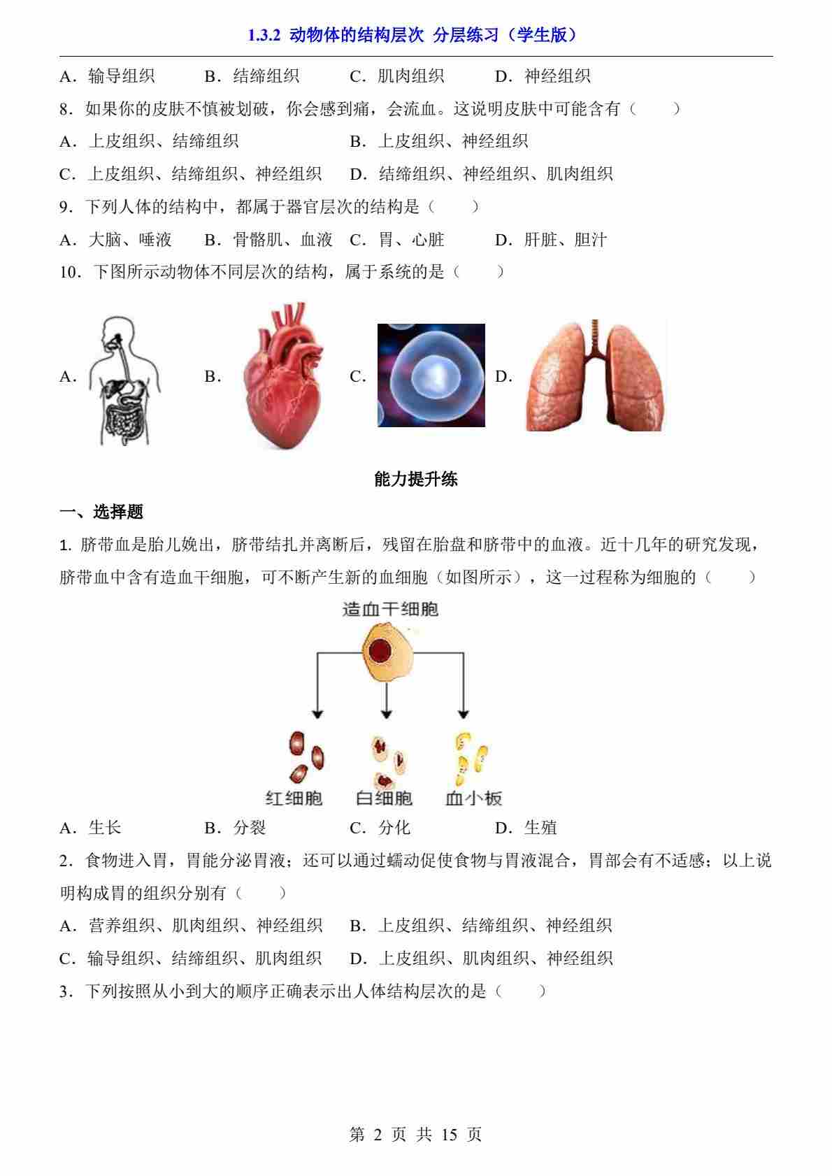 1.3.2 动物体的结构层次(分层练习)