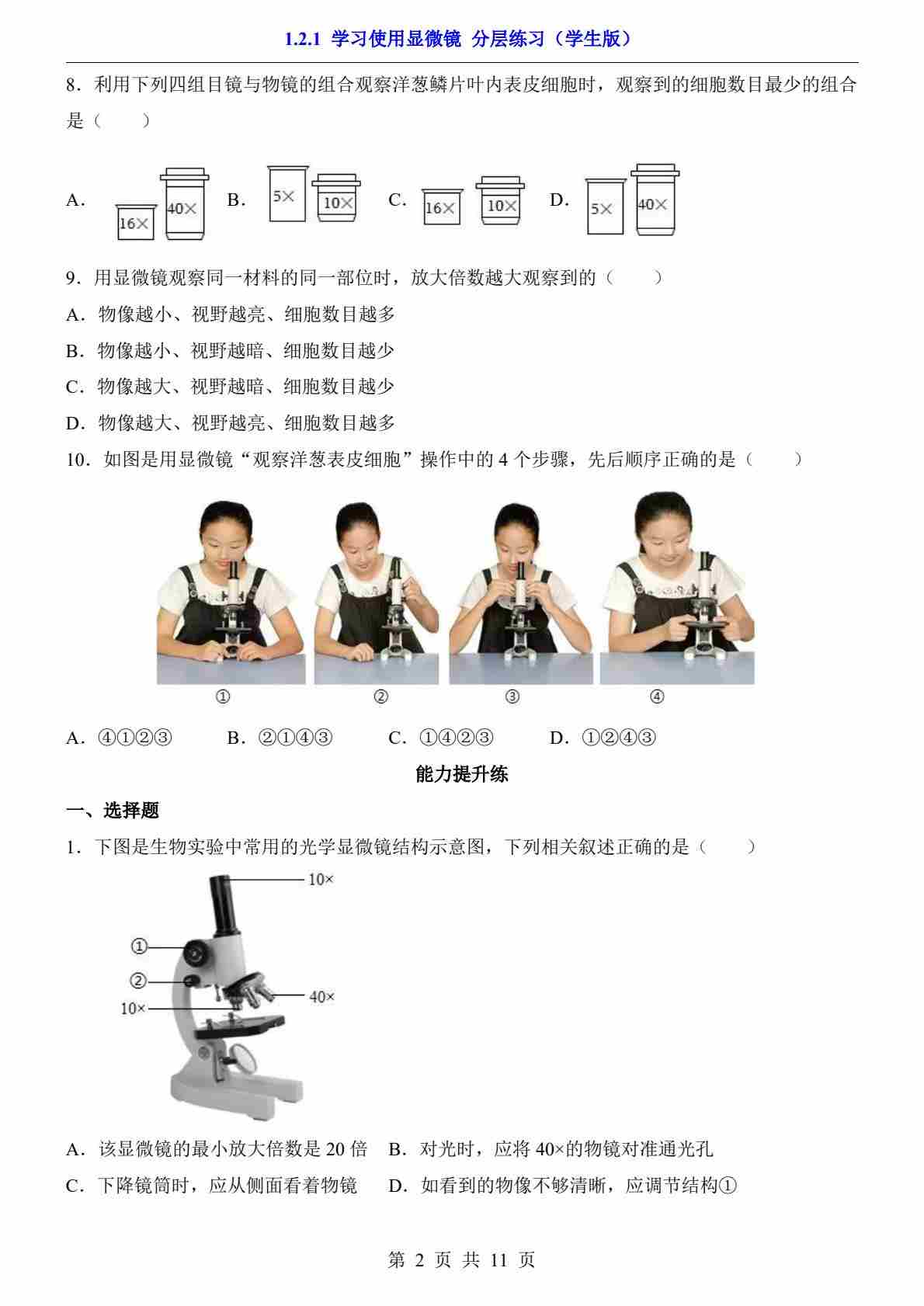 首页 > 全部 > 一课一练 > 1.2.1 学习使用显微镜(分层练习)