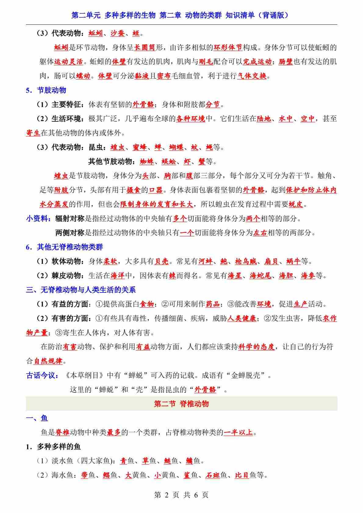 首页 > 全部 > 知识梳理 > 第2单元 第2章 动物的类群(知识清单-背诵版)