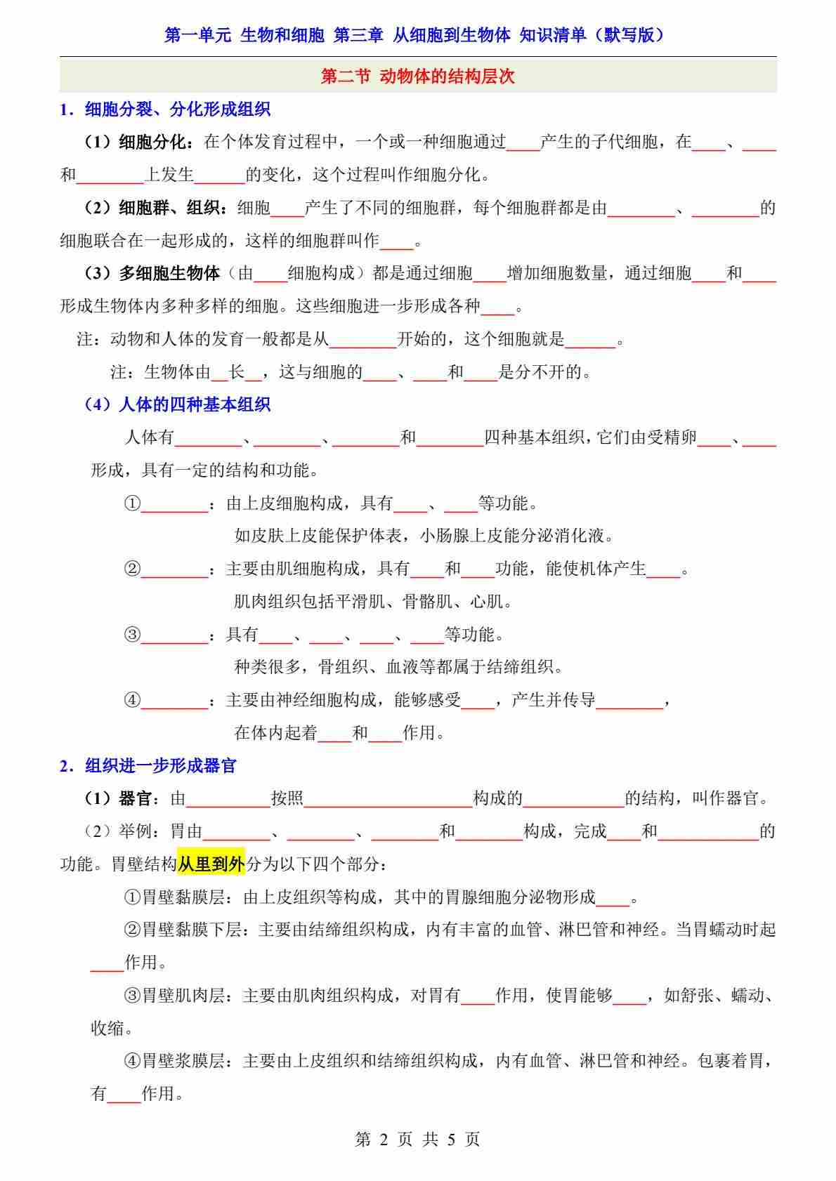 首页 > 全部 > 知识梳理 > 第1单元 第3章 从细胞到生物体(知识清单-默写版)