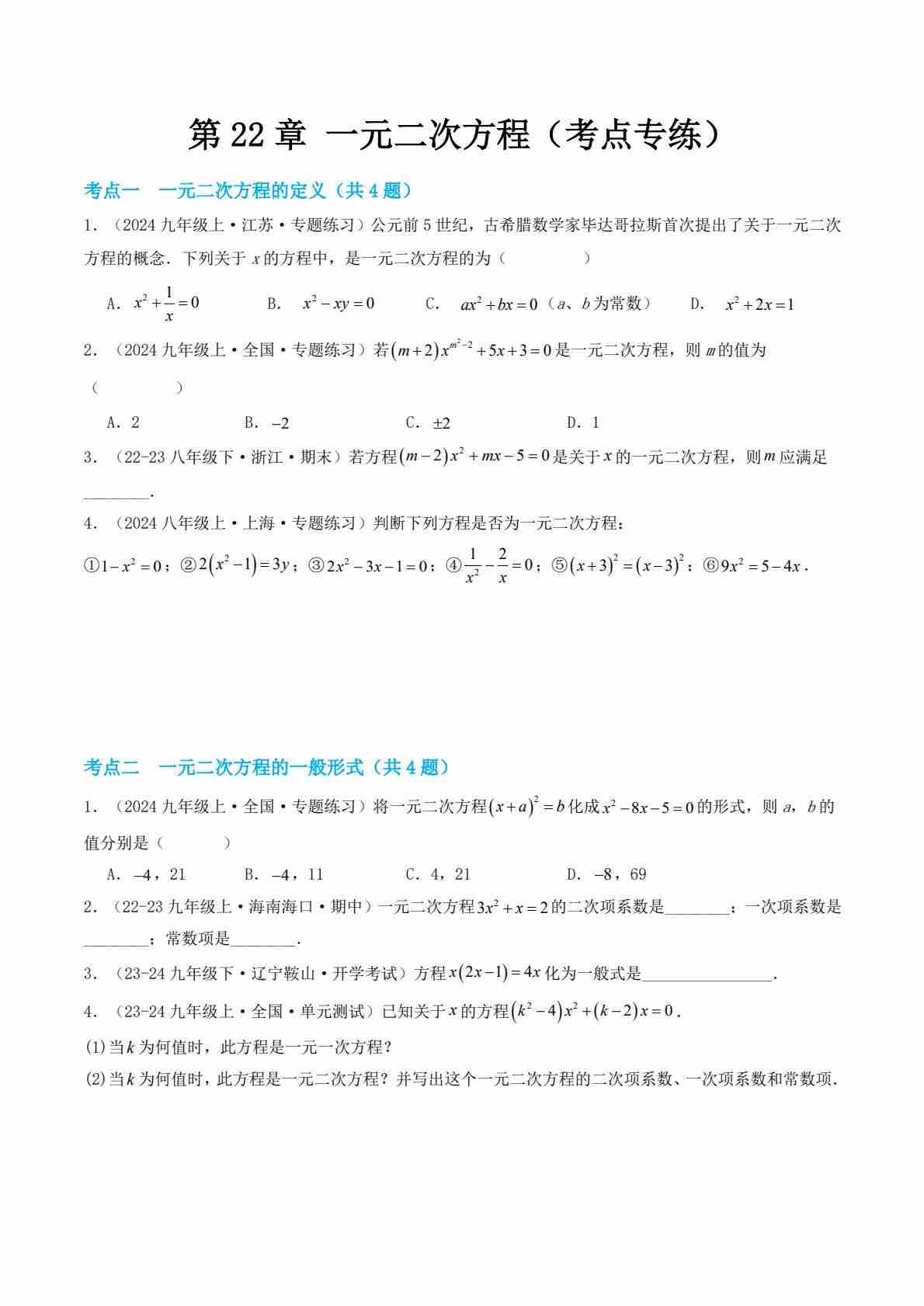 第22章 一元二次方程(考点专练)(原卷版)-2024-2025学年九年级数学上册单元速记·巧练(华东师大版)