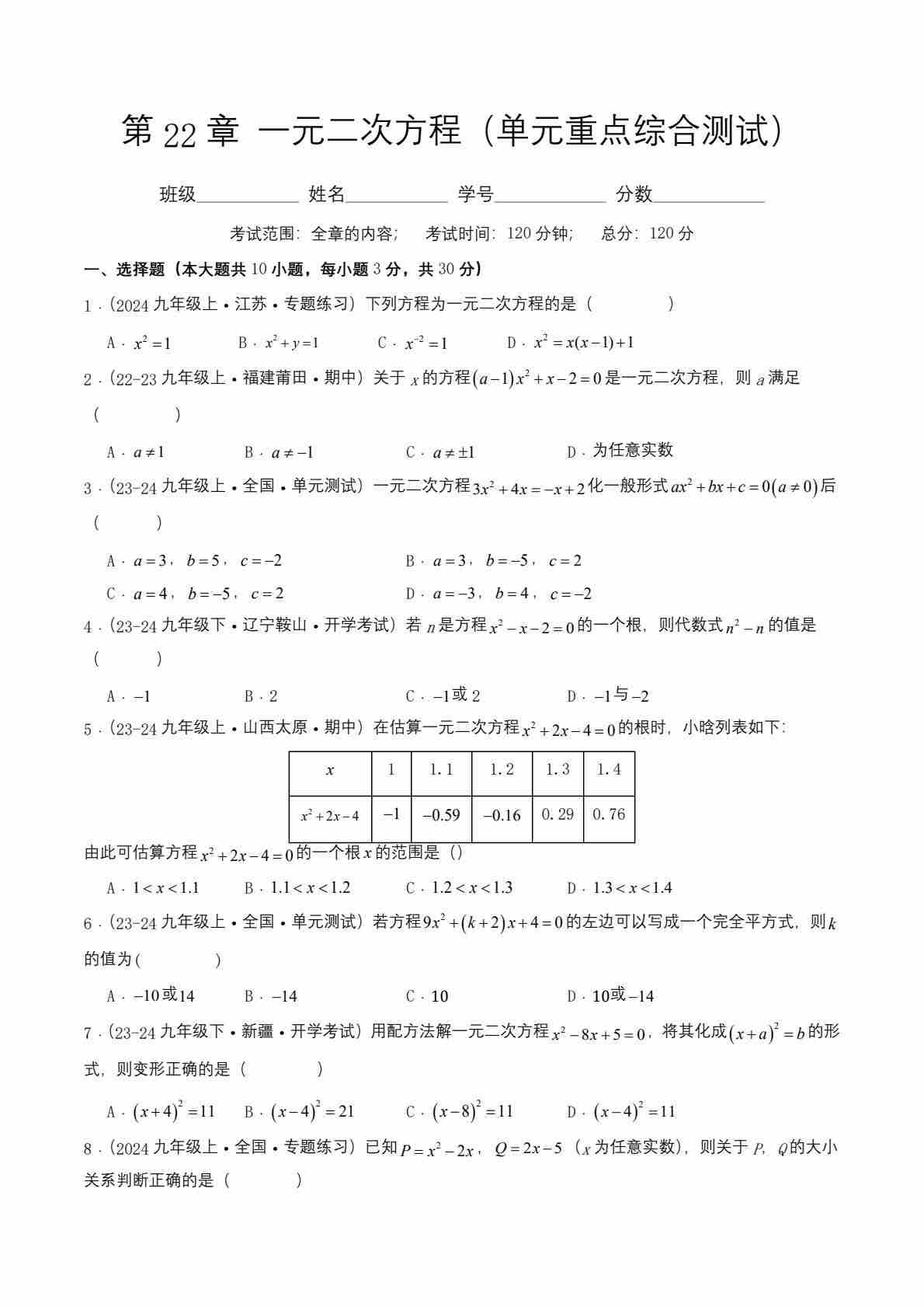 第22章 一元二次方程(单元重点综合测试)(原卷版)-2024-2025学年九年级数学上册单元速记·巧练(华东师大版)