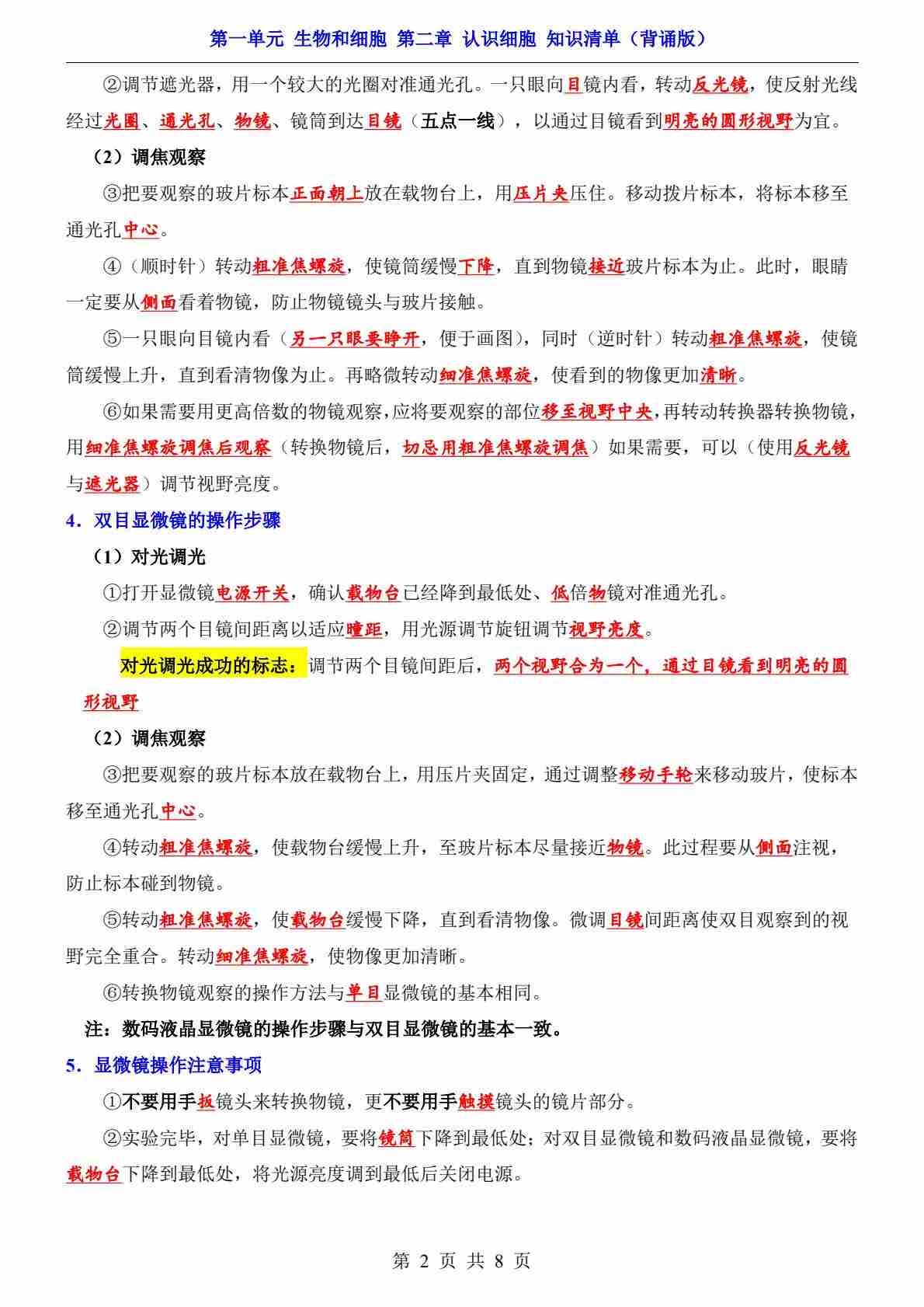 第1单元 第2章 认识细胞(知识清单-背诵版)