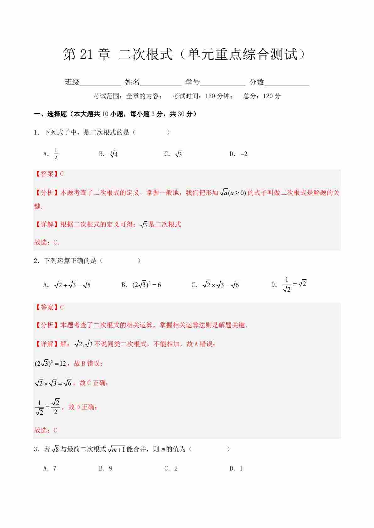 首页 > 全部 > 单元速记 > 第21章 二次根式(单元重点综合测试)(解析版)-2024-2025学年九年级数学上册单元速记·巧练(华东师大版)