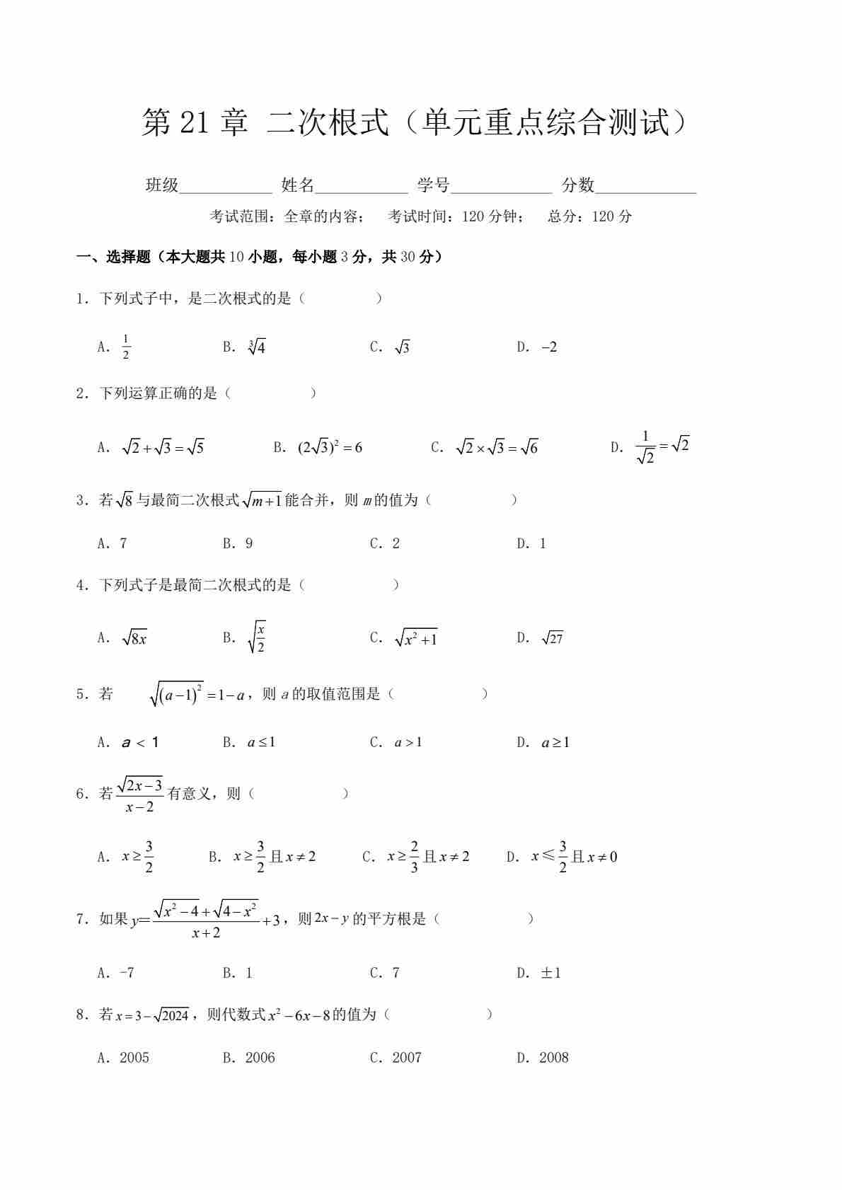 首页 > 全部 > 单元速记 > 第21章 二次根式(单元重点综合测试)(原卷版)-2024-2025学年九年级数学上册单元速记·巧练(华东师大版)