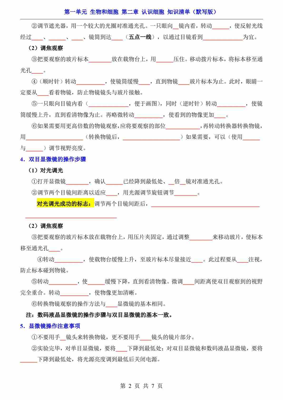 首页 > 全部 > 知识梳理 > 第1单元 第2章 认识细胞(知识清单-默写版)