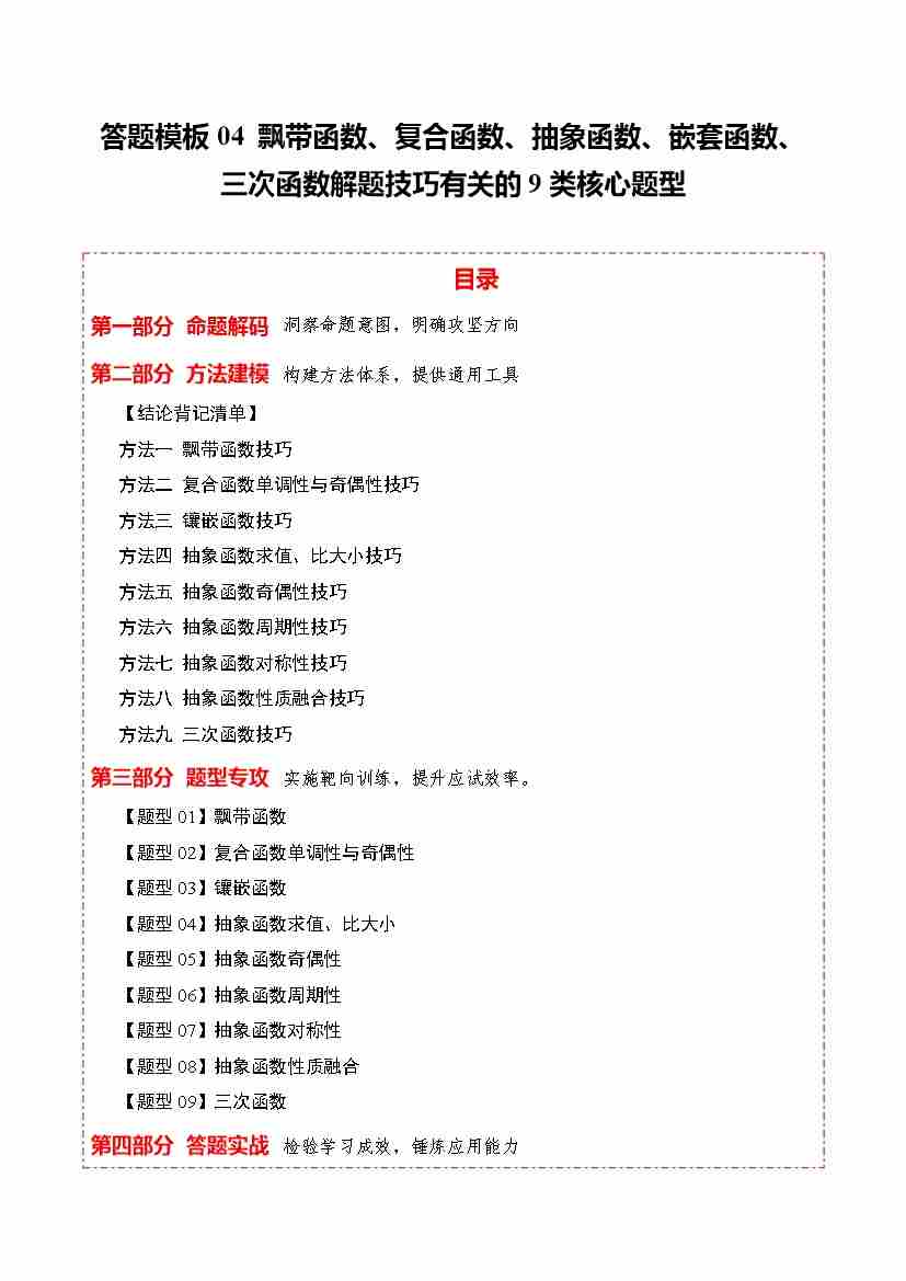 答题模板04 飘带函数、复合函数、抽象函数、嵌套函数、三次函数解题技巧有关的9类核心题型(方法、题型、实战)(学生版)