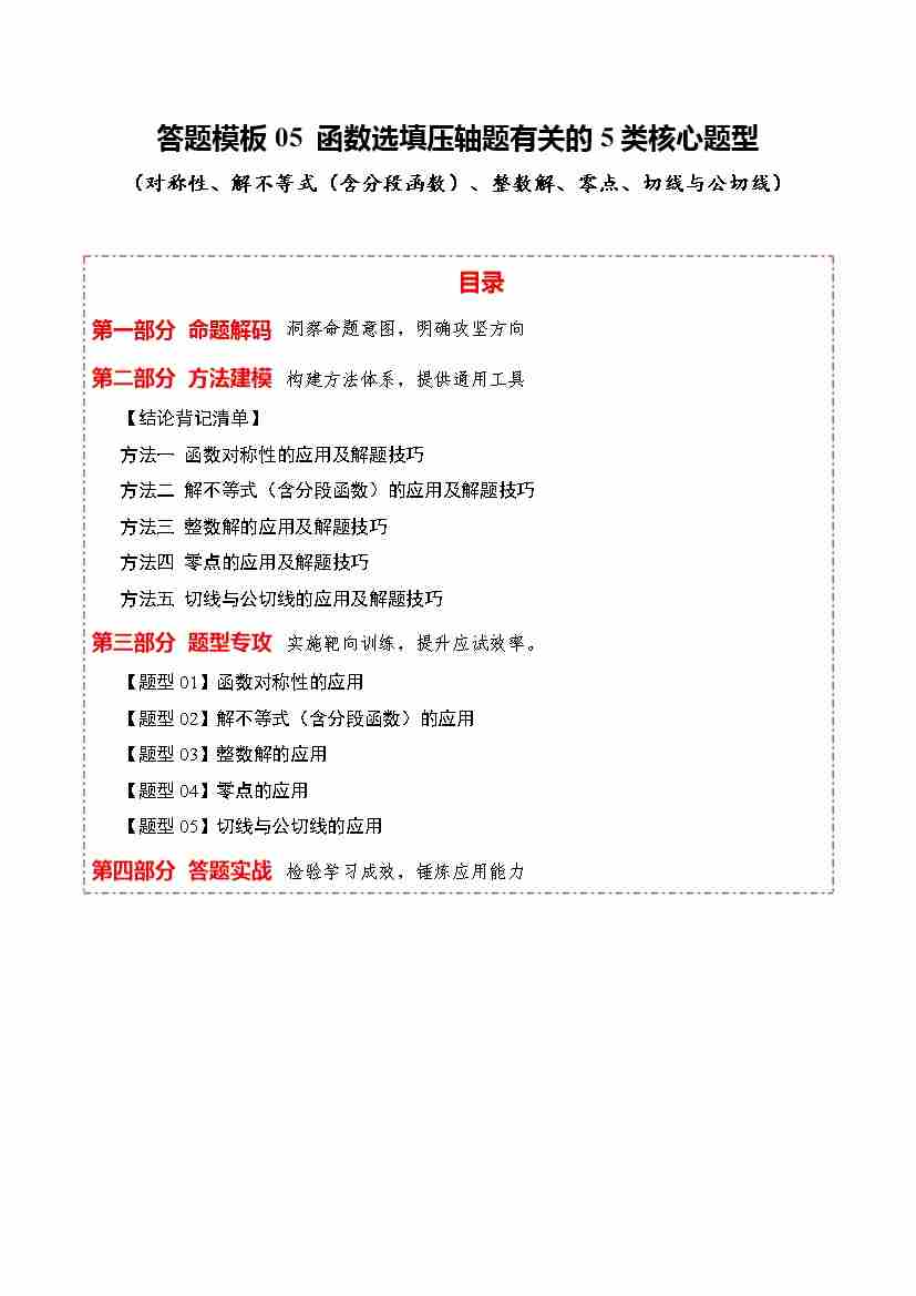 答题模板05 函数选填压轴题有关的5类核心题型(对称性、解不等式(含分段函数)、整数解、零点、切线与公切线)(方法、题型、实战)(学生版)