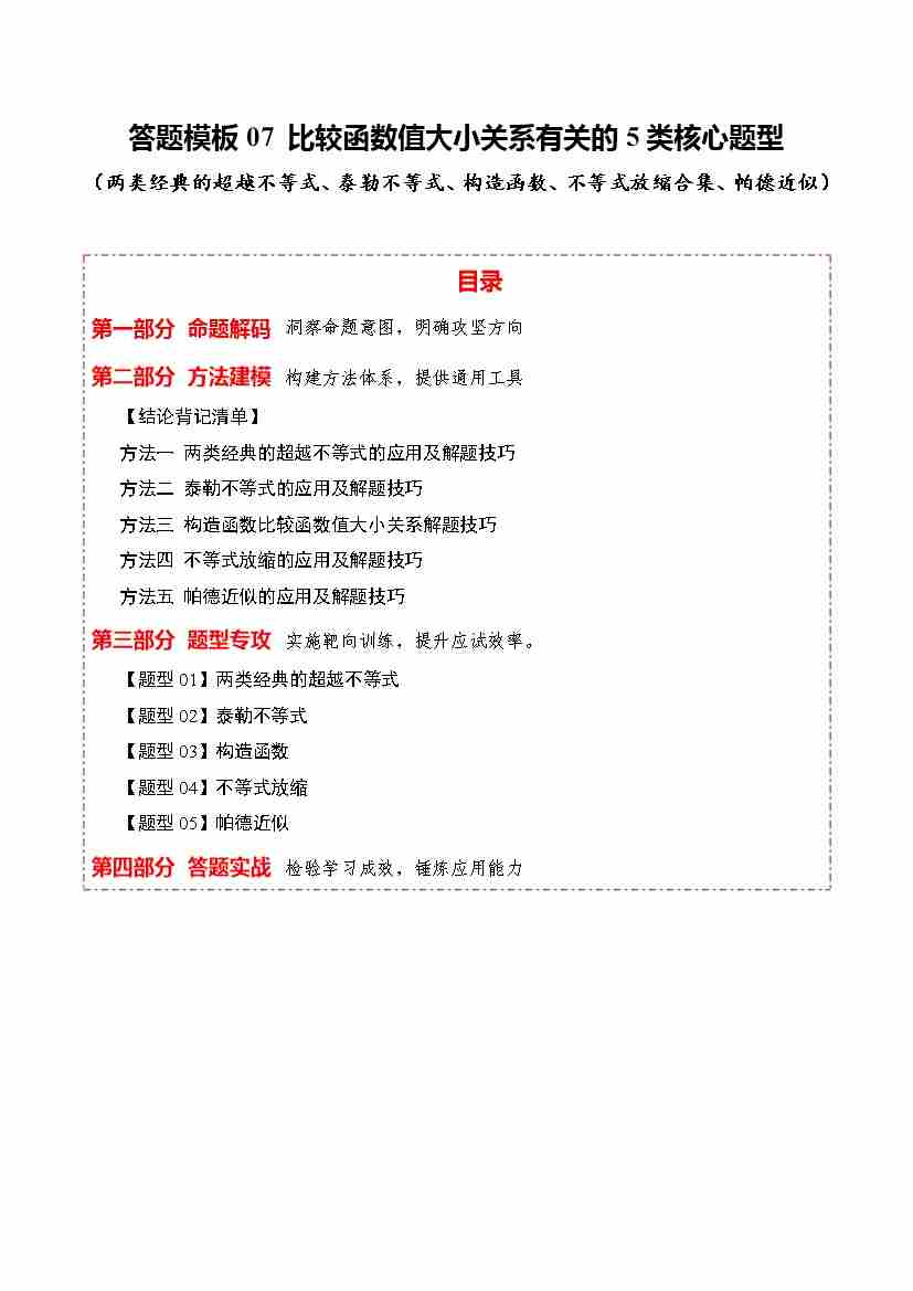 答题模板07 比较函数值大小关系有关的5类核心题型(两类经典的超越不等式、泰勒不等式、构造函数、不等式放缩合集、帕德近似)(方法、题型、实战)(学生版)