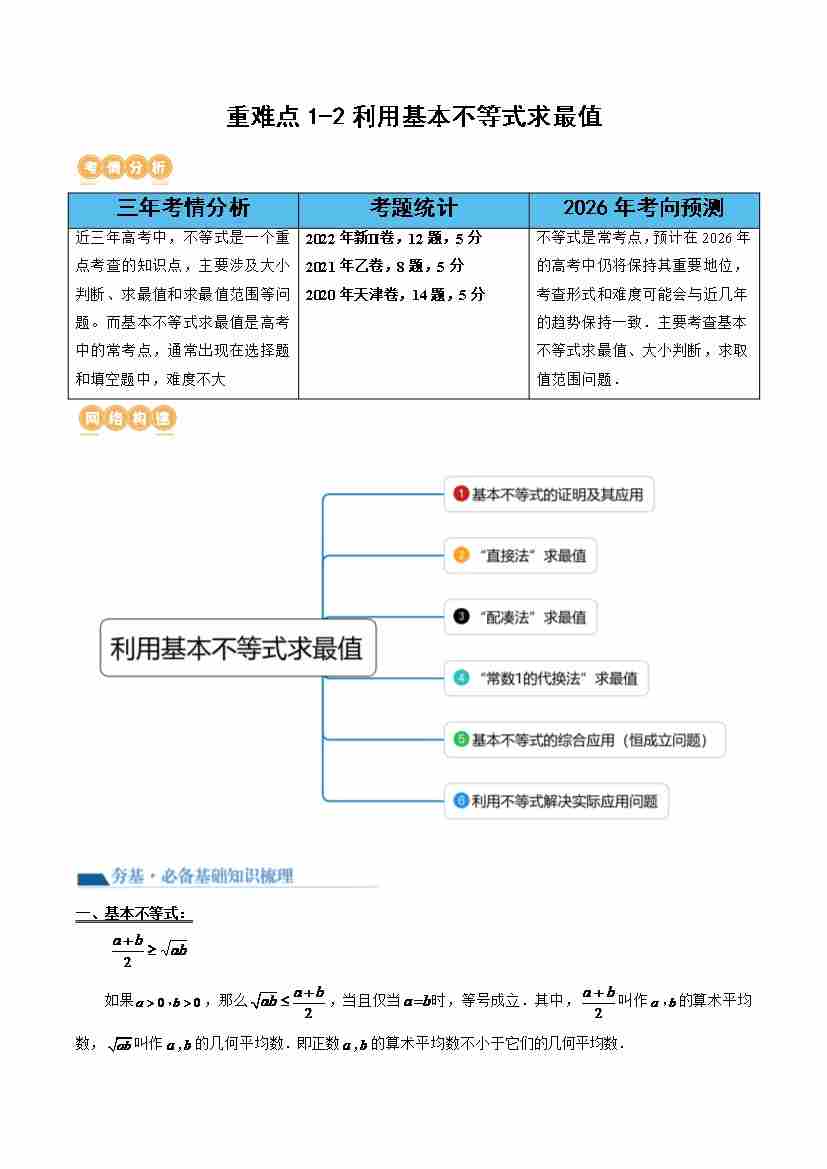 重难点1-2 利用基本不等式求最值(6重难点题型、4秒杀技巧与性质、题型特训)(学生版)