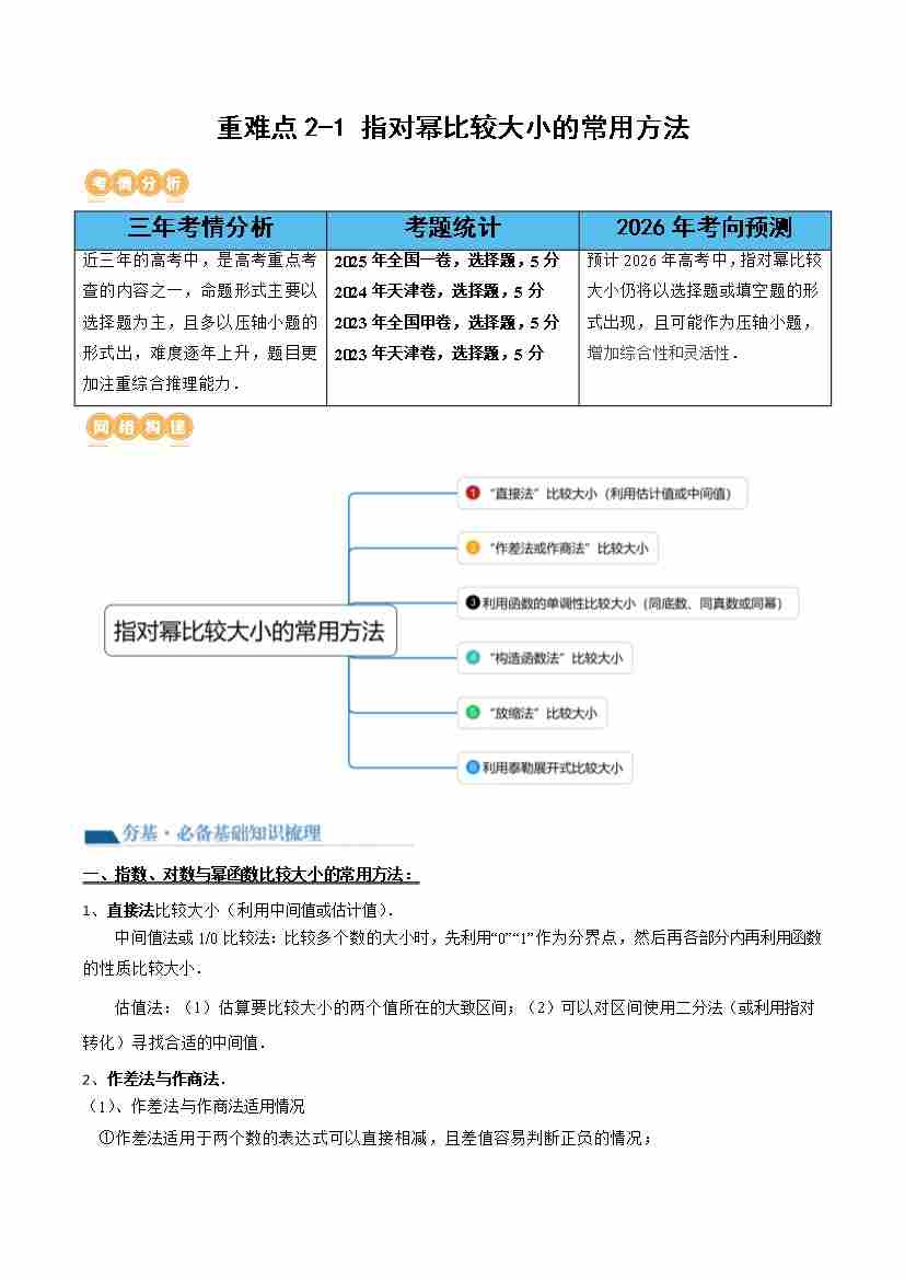 重难点2-1 指对幂比较大小的常用方法(6重难点题型、10秒杀技巧与性质、题型特训)(学生版)