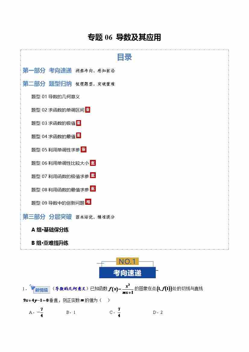 专题06 导数及其应用(切线、单调性、极值、最值)(专题专练)(学生版)
