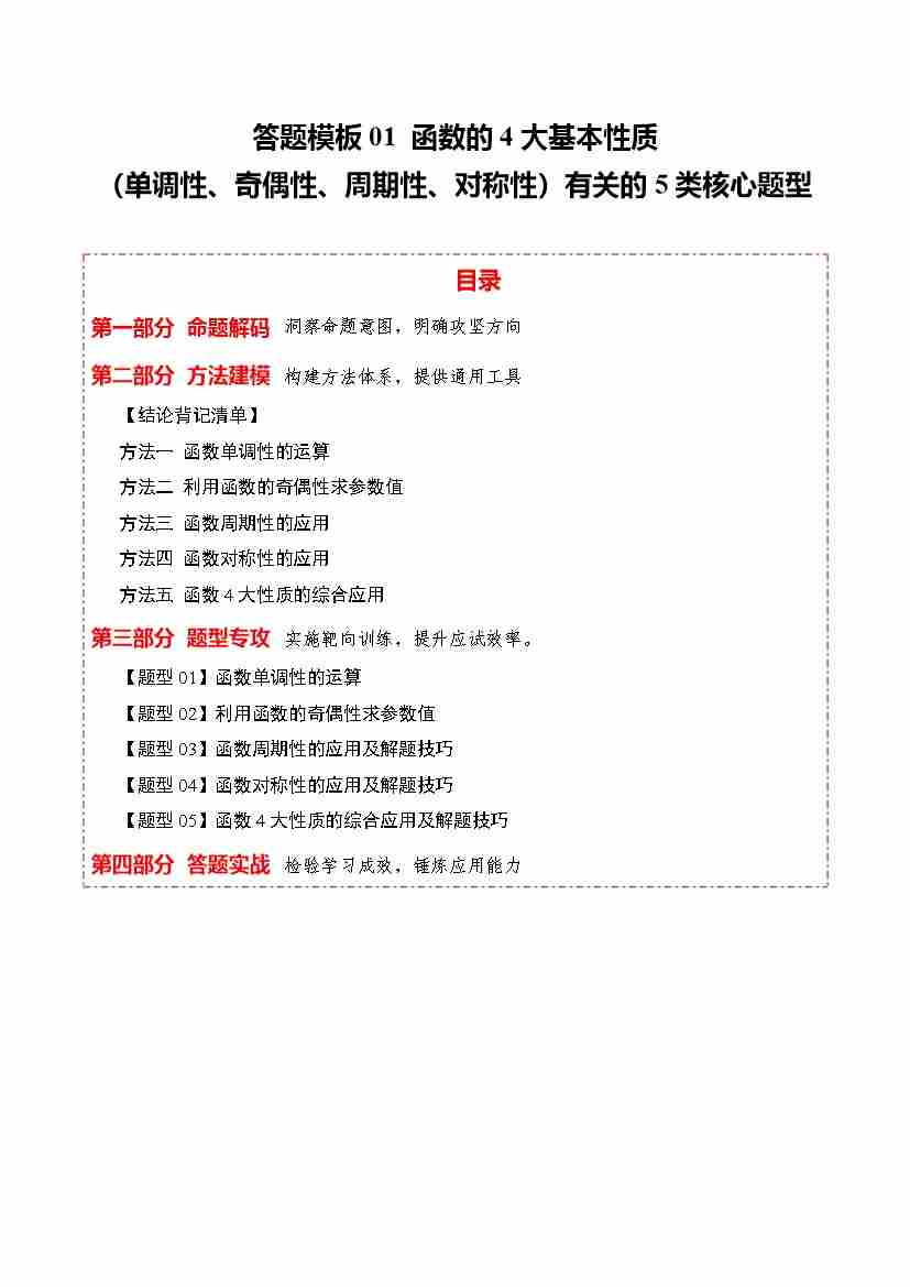 答题模板01 函数的4大基本性质(单调性、奇偶性、周期性、对称性)有关的5类核心题型(方法、题型、实战)(学生版)