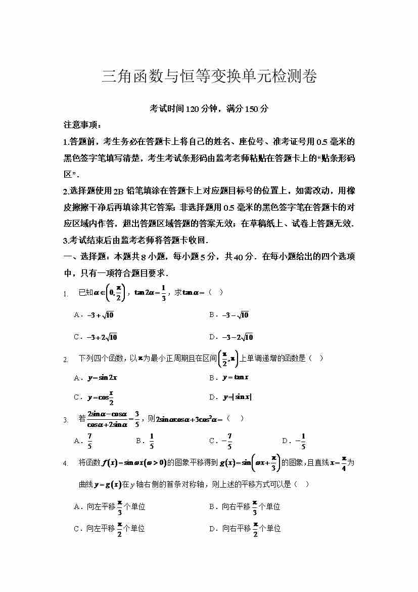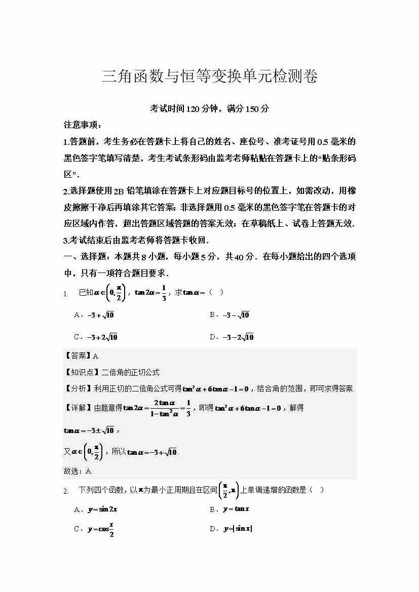 三角函数与恒等变换单元检测学生版