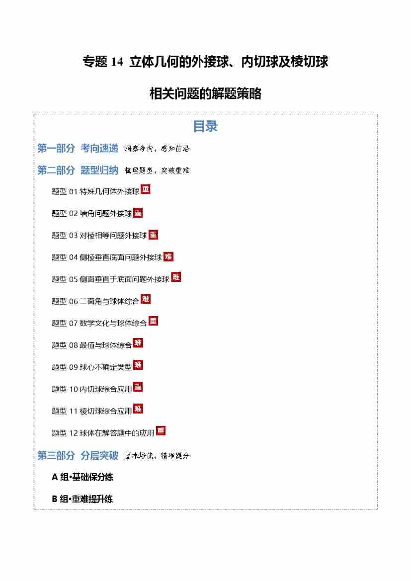 专题14 立体几何的外接球、内切球及棱切球相关问题的解题策略12大题型(专题专练)(全国通用)(学生版)