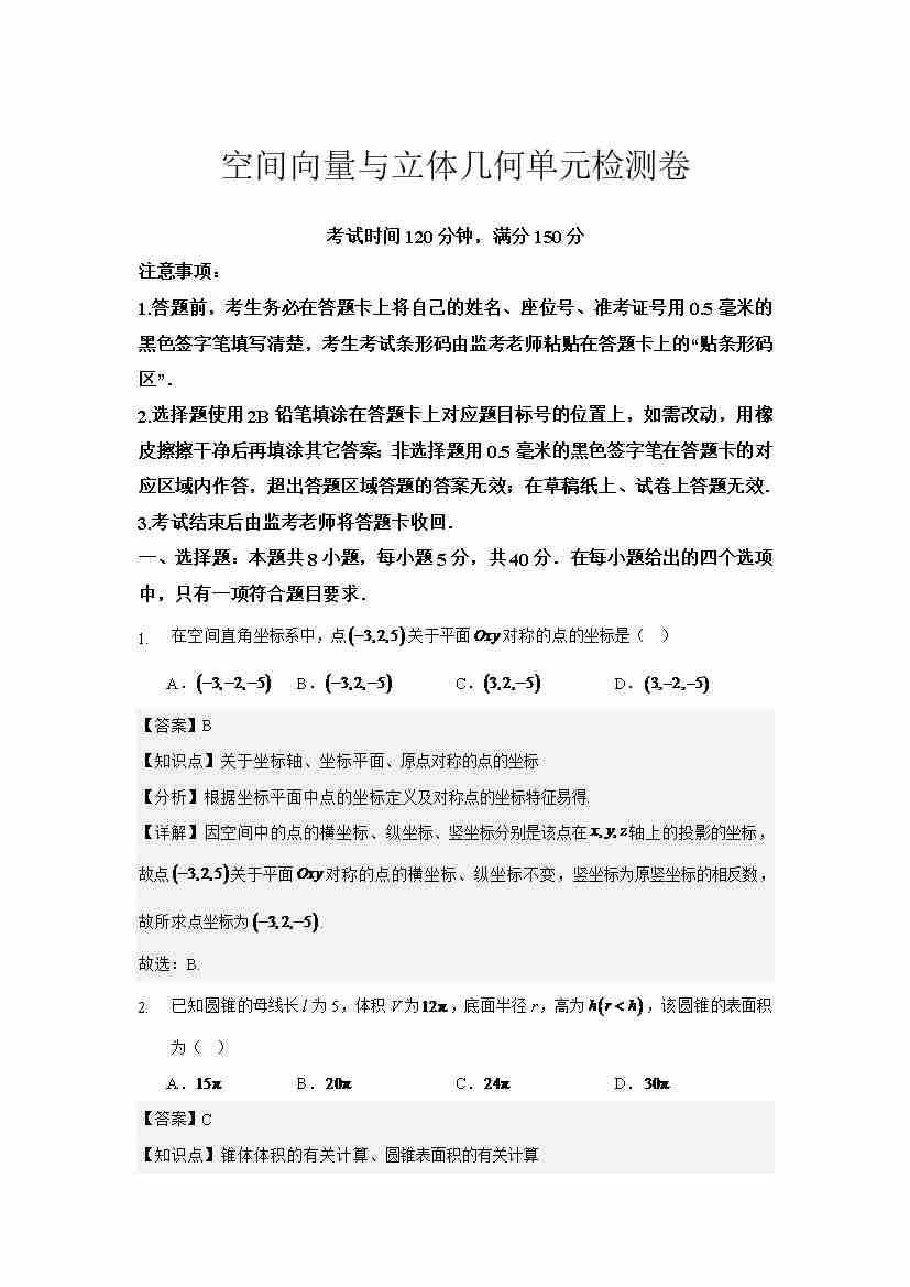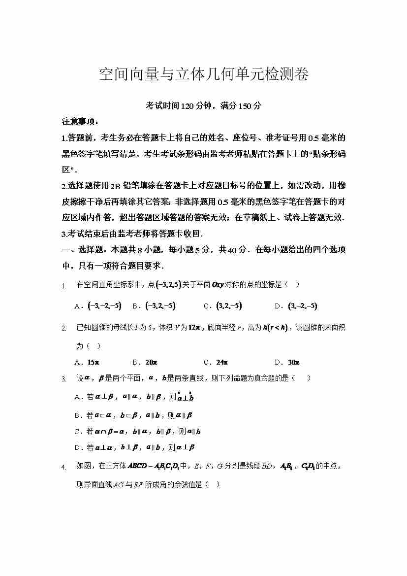 空间向量与立体几何单元检测卷学生版