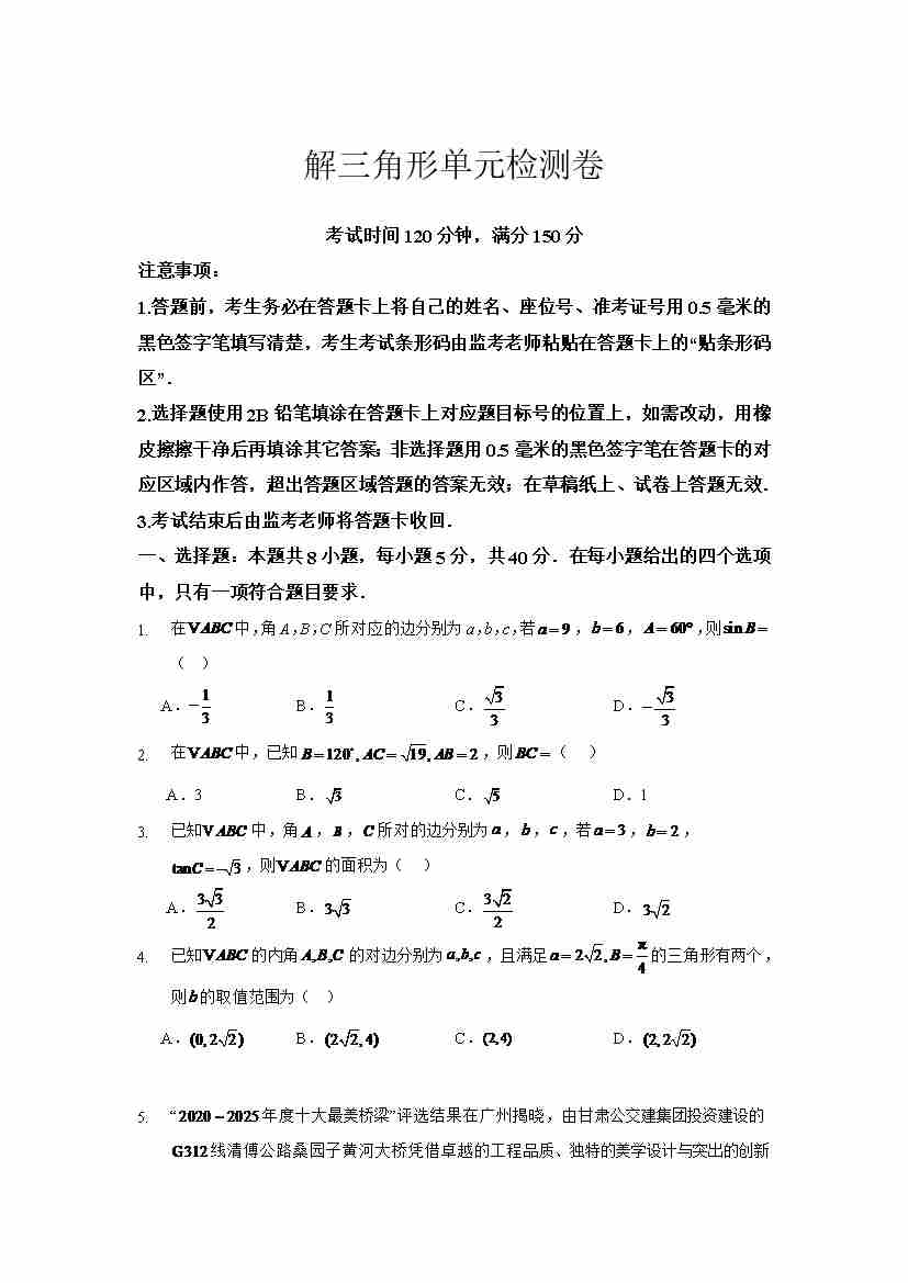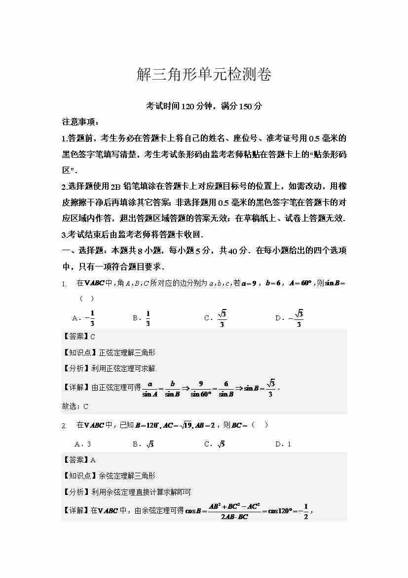 解三角形单元检测学生版