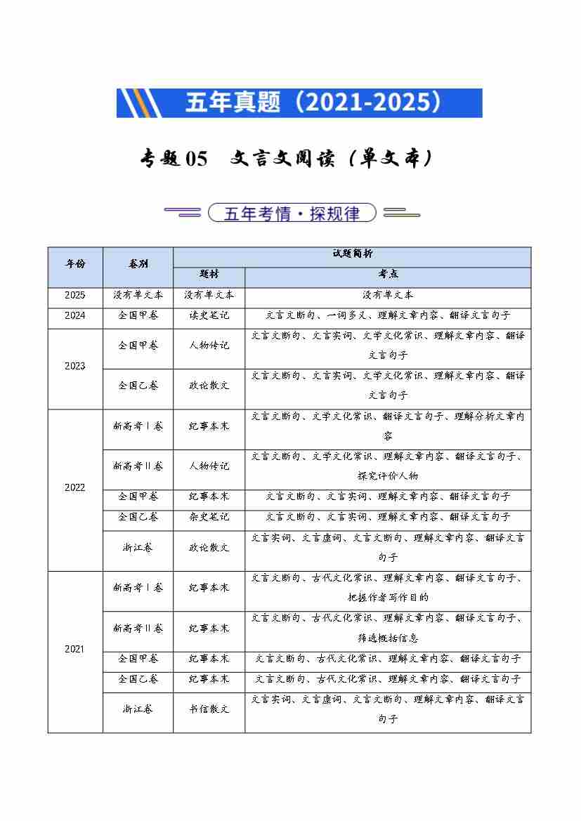 专题05 文言文阅读(单文本)(全国通用)(学生版)