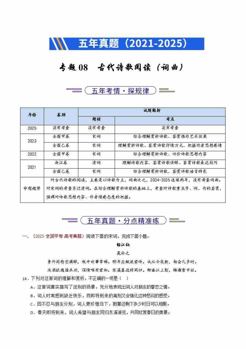 专题08 古代诗歌阅读(词曲)(全国通用)(学生版)