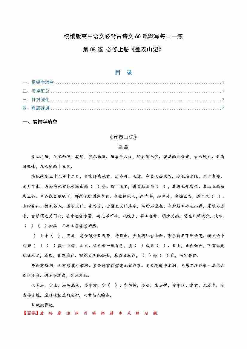 第08练 必修上册《登泰山记》理解性默写(教师版)
