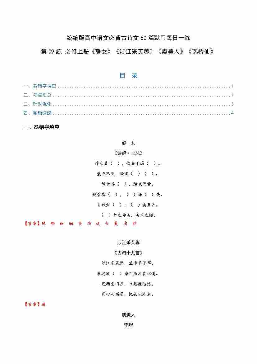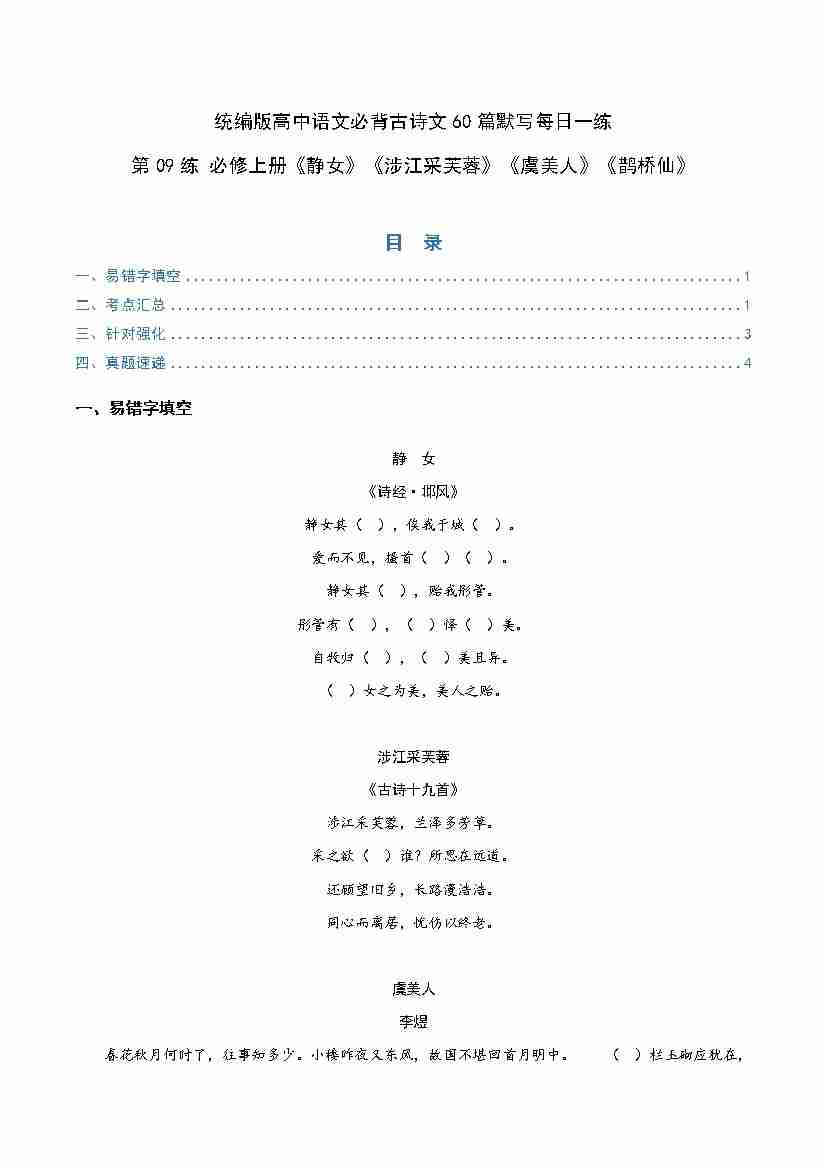 第09练 必修上册《静女》《涉江采芙蓉》《虞美人》《鹊桥仙》理解性默写(学生版)