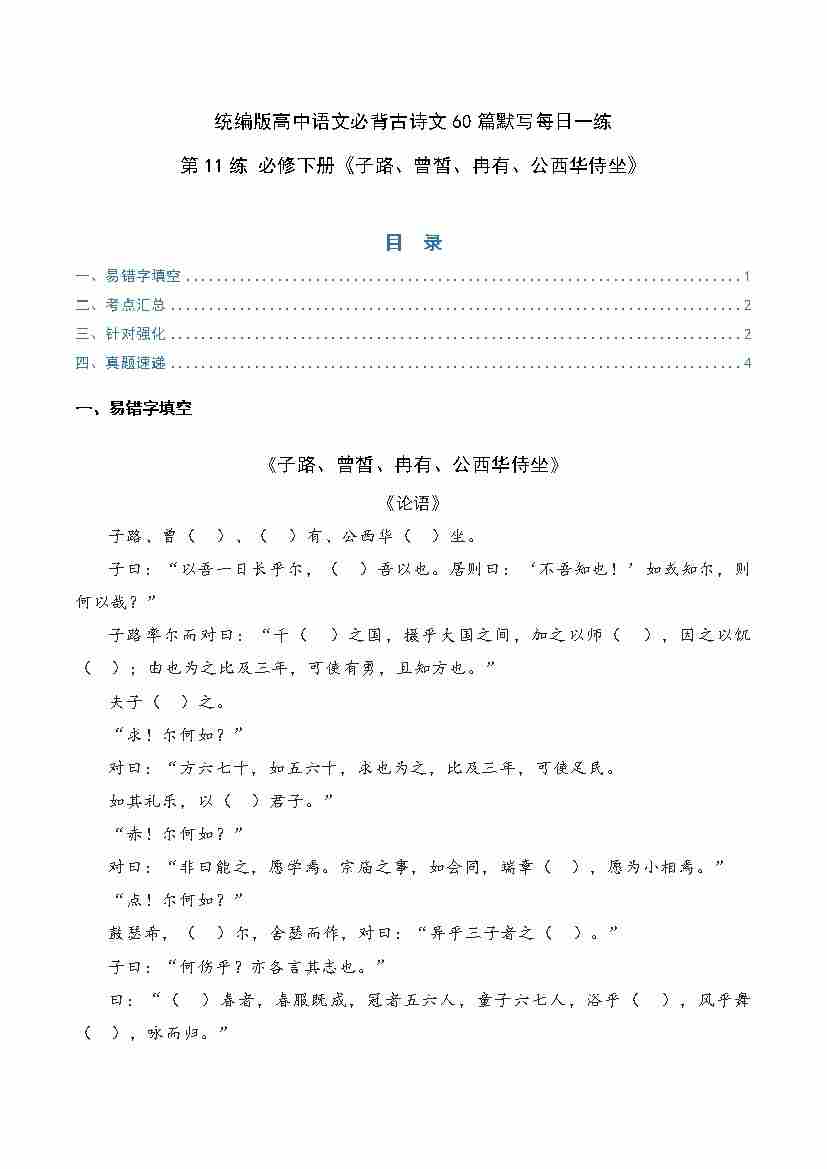 第11练必修下册《子路、曾皙、冉有、公西华侍坐》理解性默写(学生版)