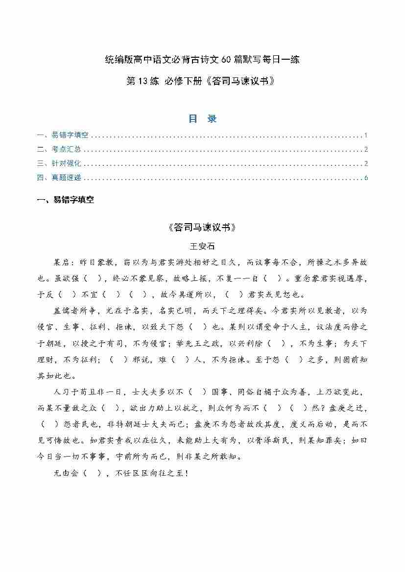 第13练必修下册《答司马谏议书》理解性默写(学生版)