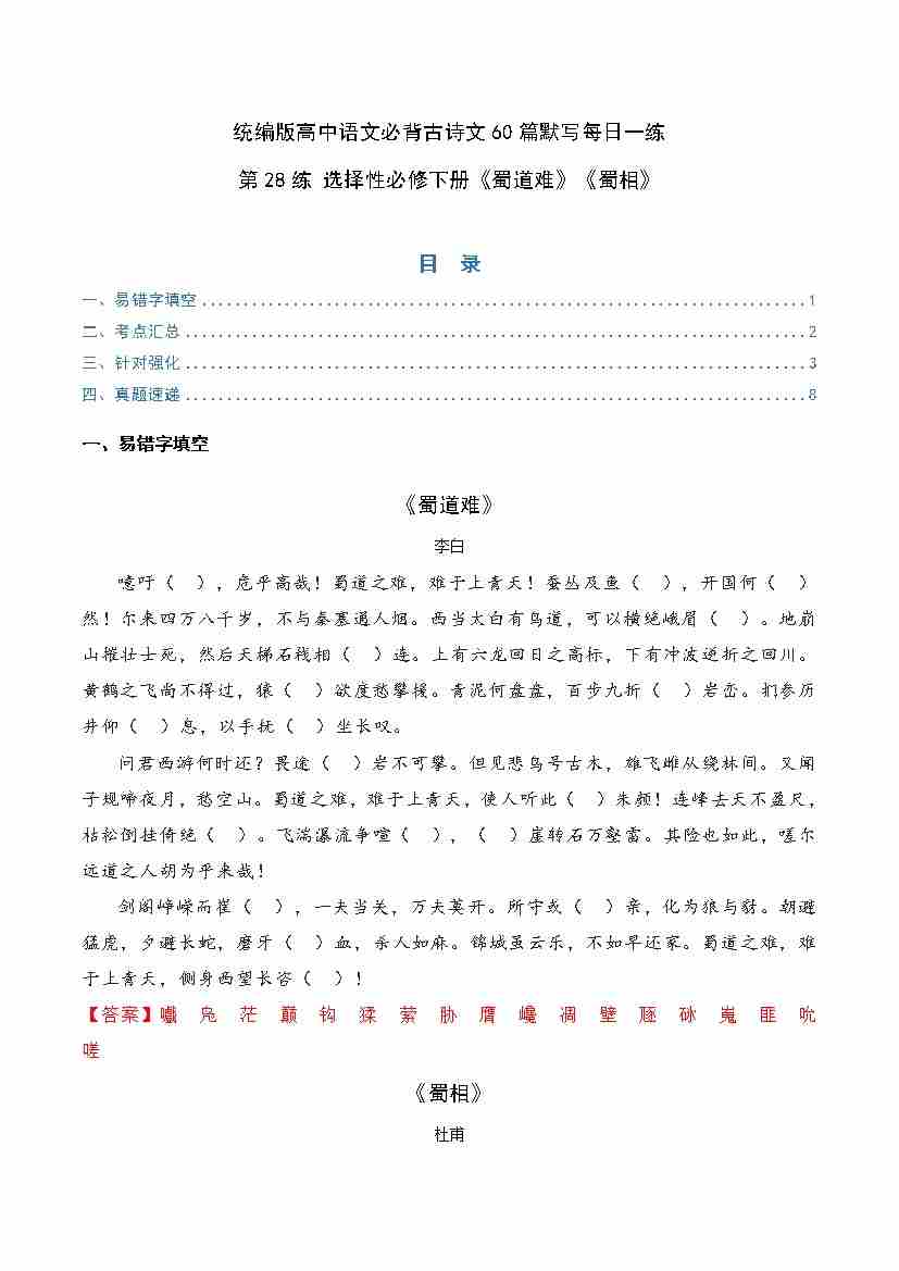 第28练 选择性必修下册《蜀道难》《蜀相》理解性默写(教师版)