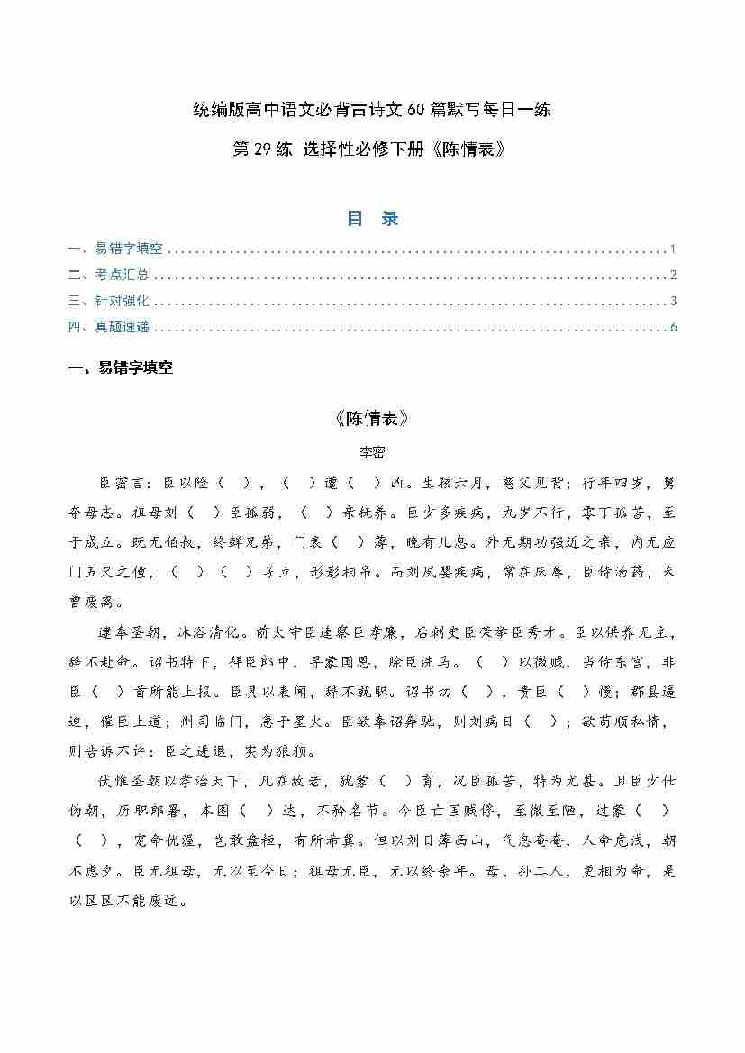 第29练 选择性必修下册《陈情表》理解性默写(学生版)