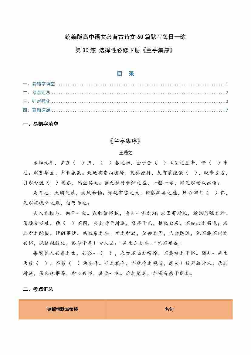 第30练 选择性必修下册《兰亭集序》理解性默写(学生版)