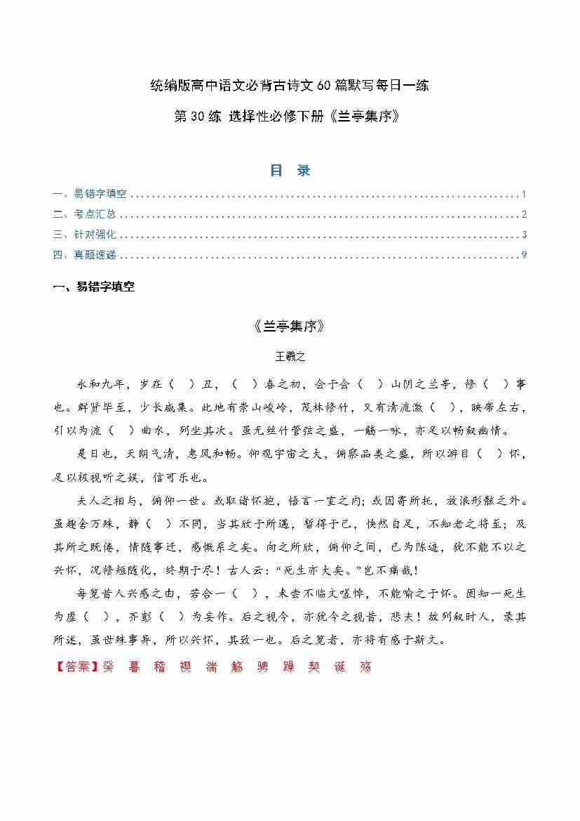 第30练 选择性必修下册《兰亭集序》理解性默写(教师版)