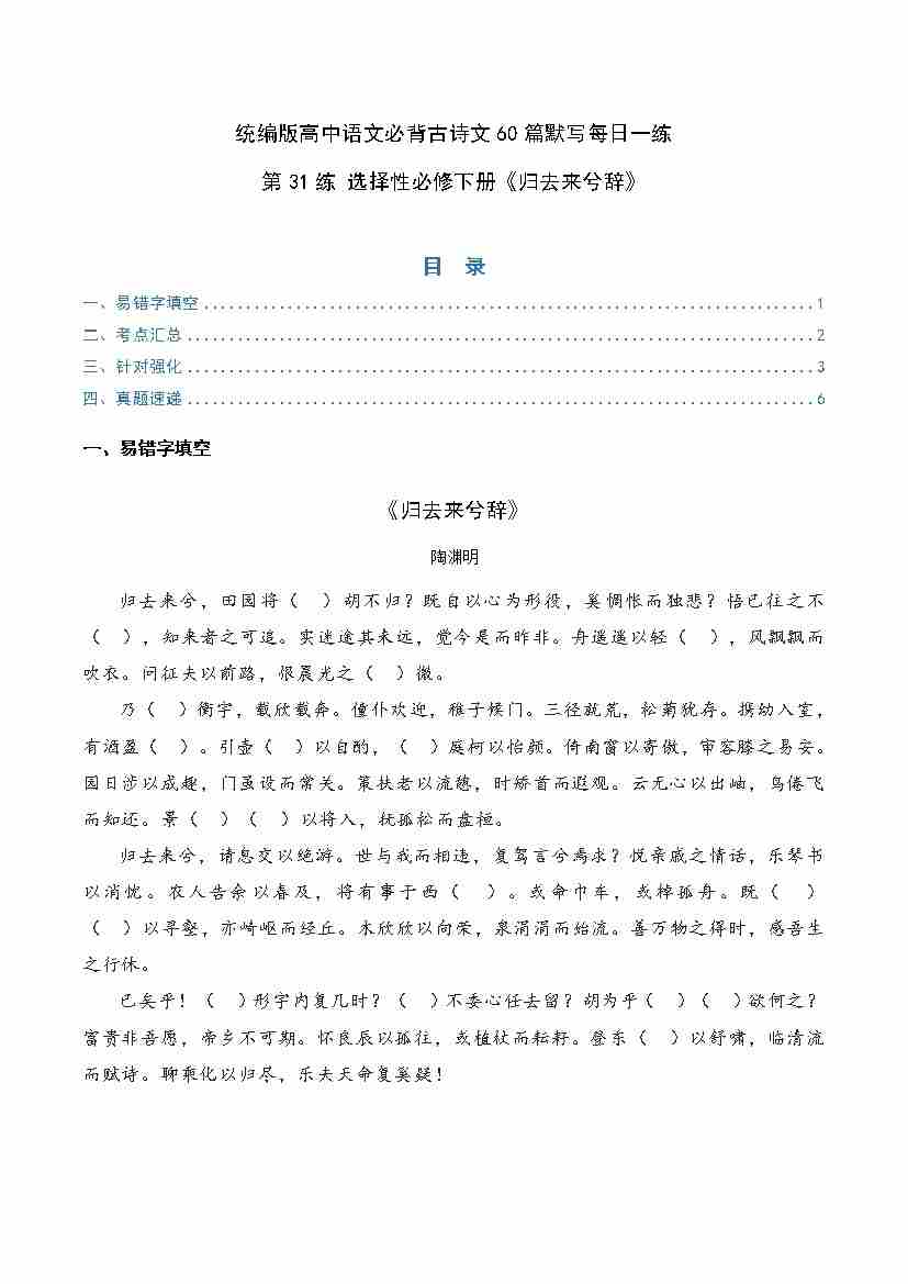 第31练 选择性必修下册《归去来兮辞》理解性默写(学生版)