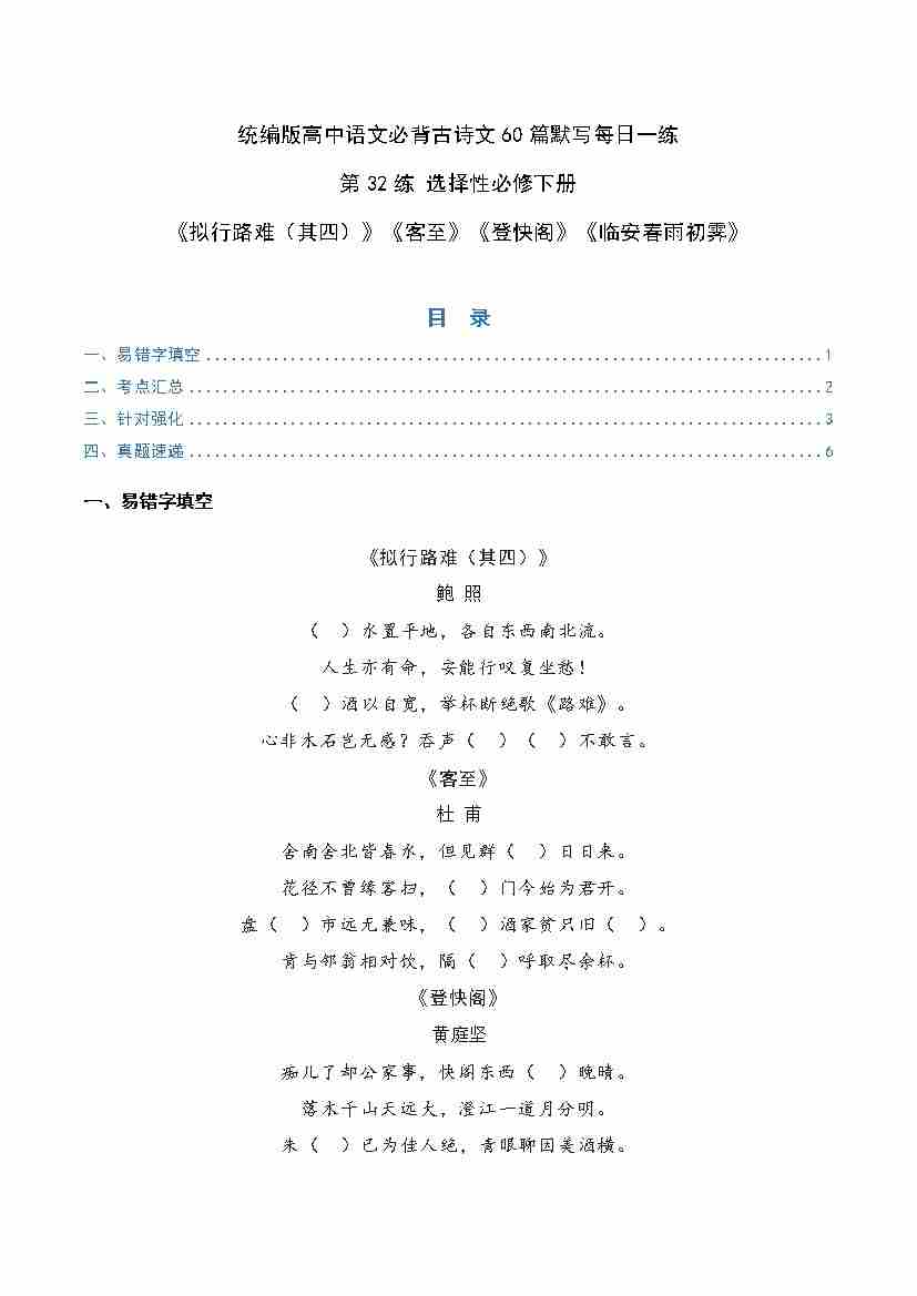 第32练 选择性必修下册《拟行路难(其四)》《客至》《登快阁》《临安春雨初霁》理解性默写(学生版)