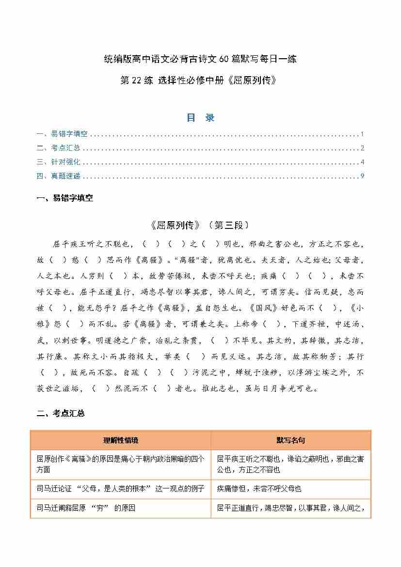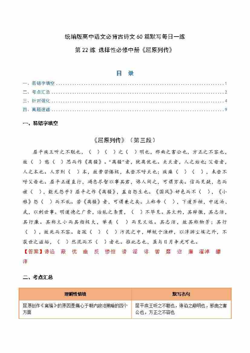 第22练 选择性必修中册《屈原列传》理解性默写(学生版)