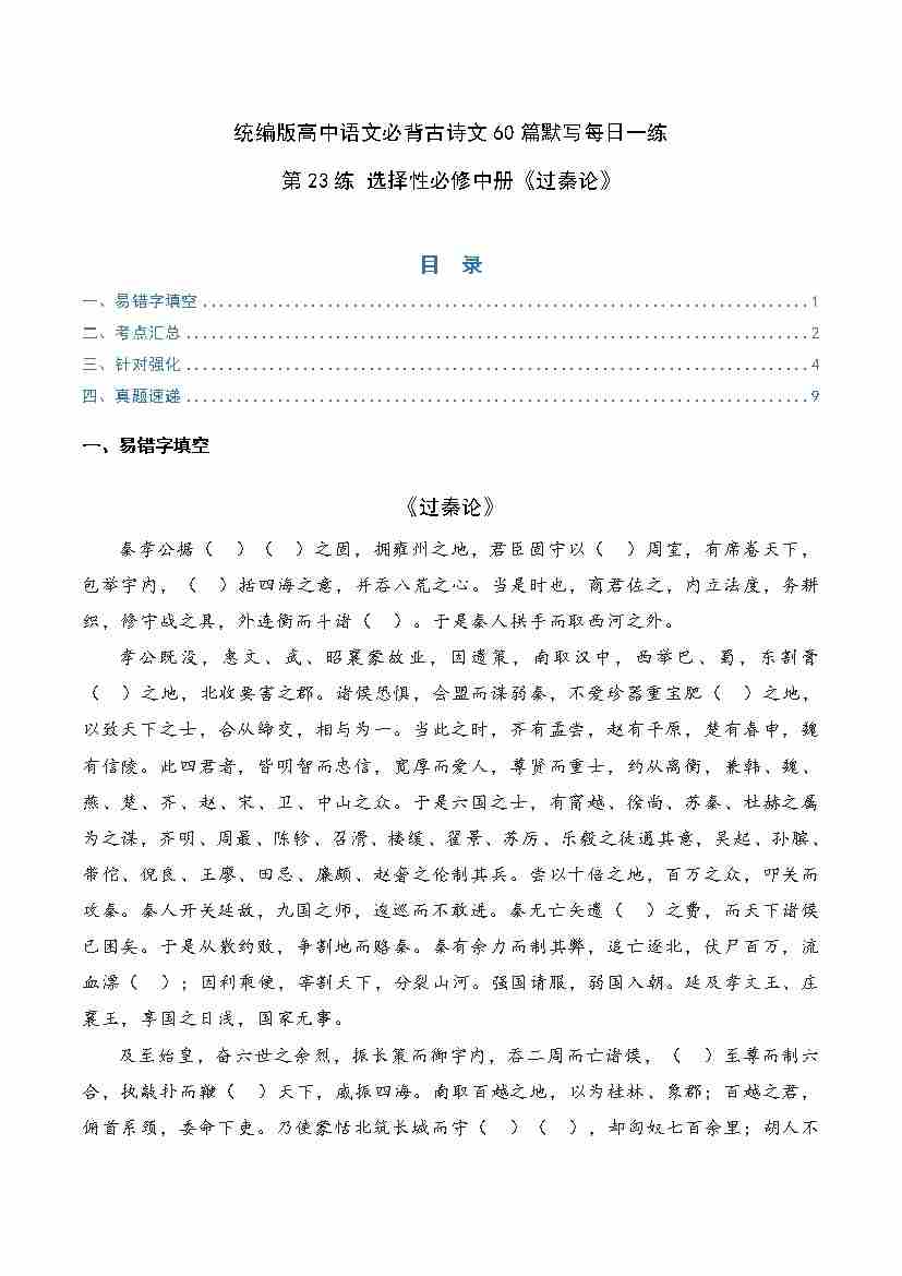 第23练 选择性必修中册《过秦论》理解性默写(学生版)
