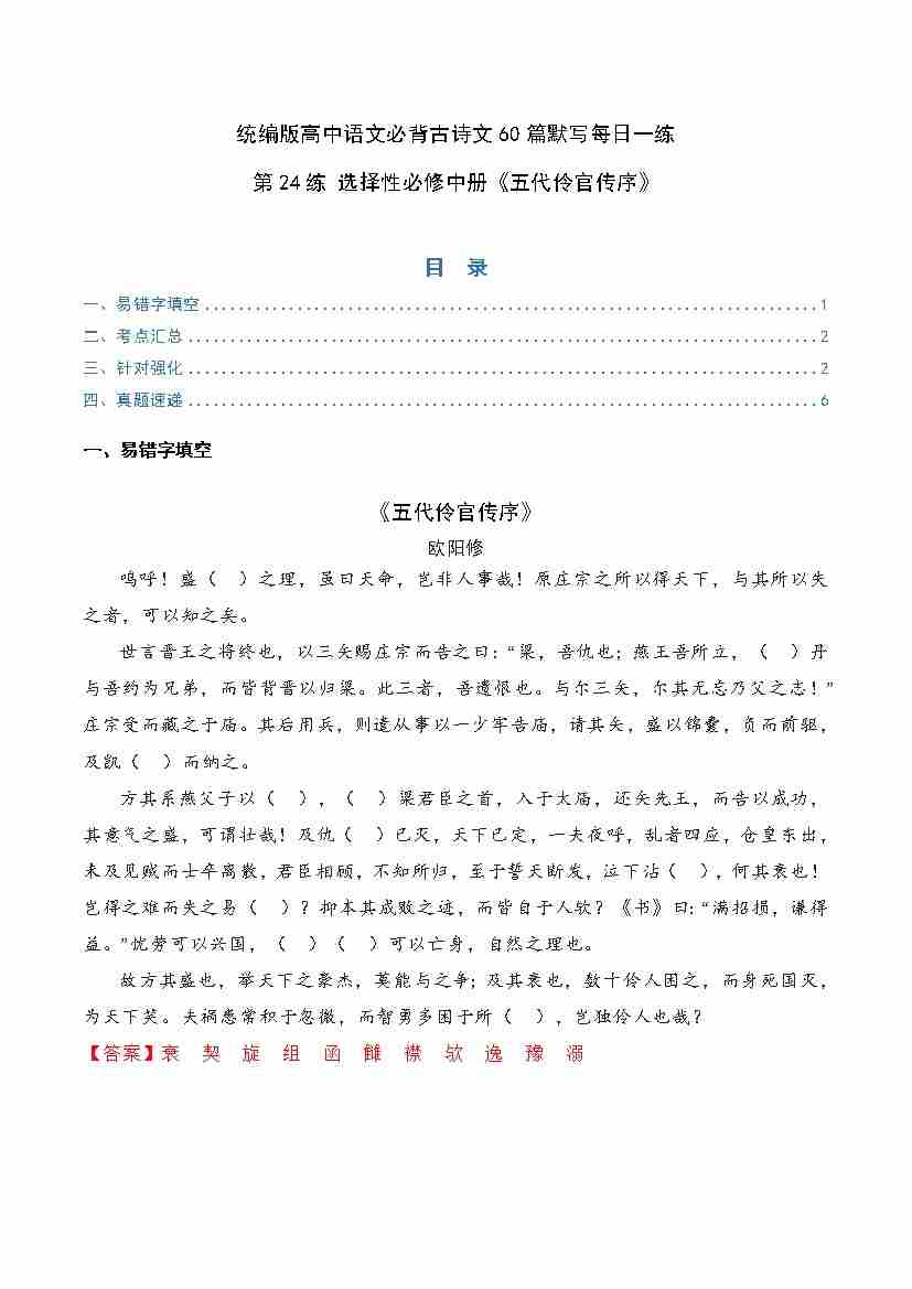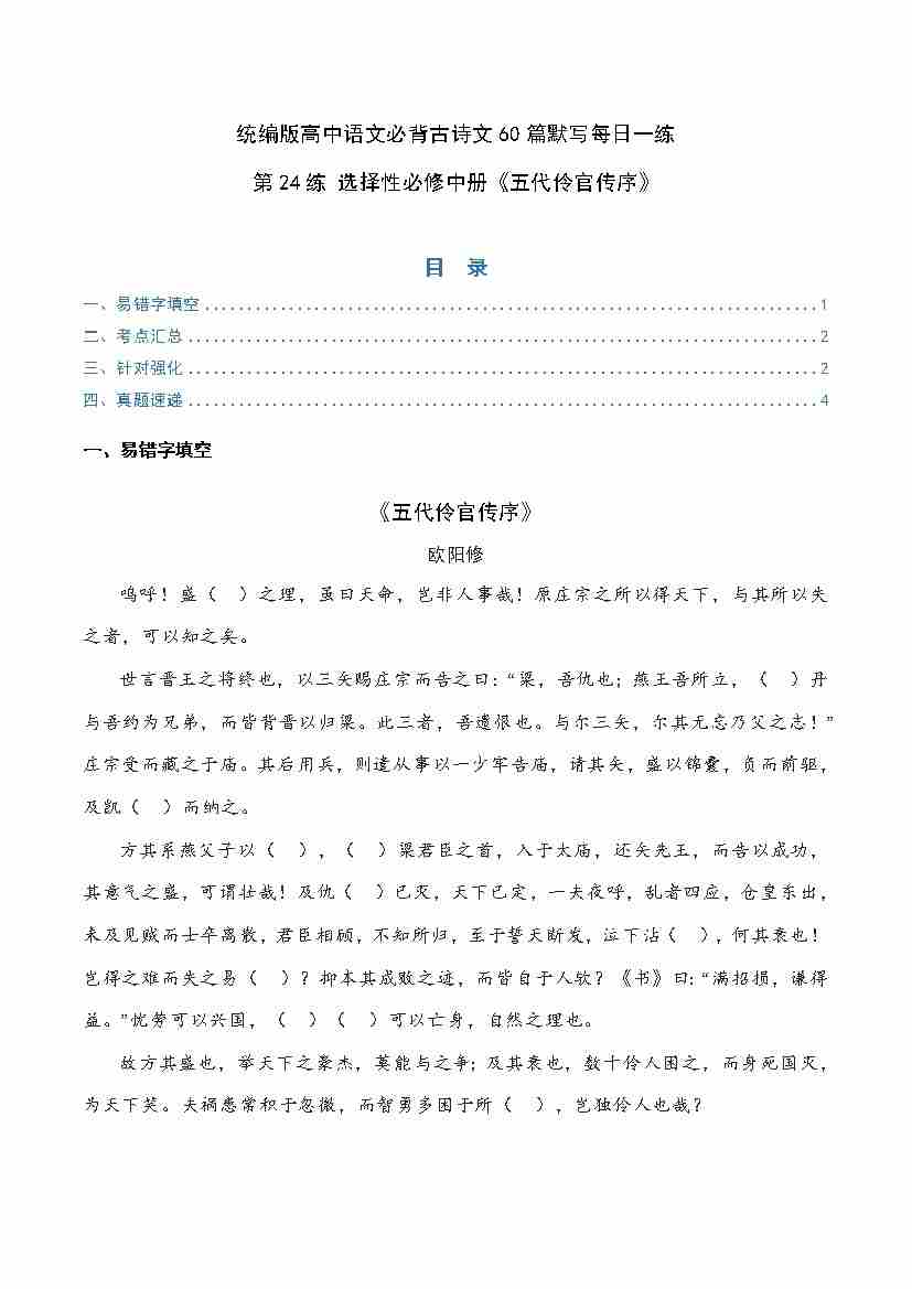 第24练 选择性必修中册《五代伶官传序》理解性默写(学生版)