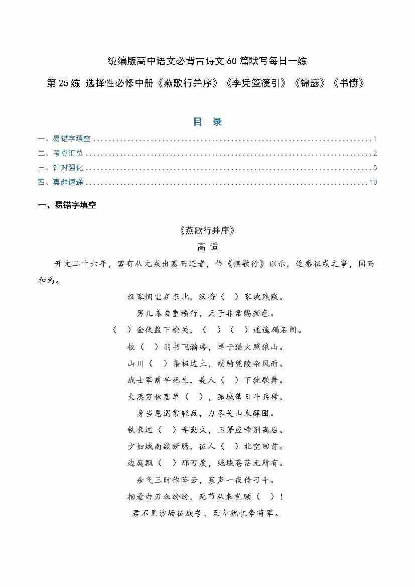 第25练 选择性必修中册《燕歌行并序》《李凭箜篌引》《锦瑟》《书愤》理解性默写(学生版)