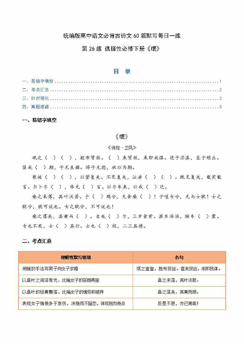 第26练 选择性必修下册《氓》理解性默写(学生版)