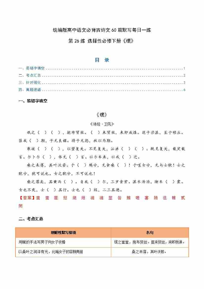 第26练 选择性必修下册《氓》理解性默写(教师版)