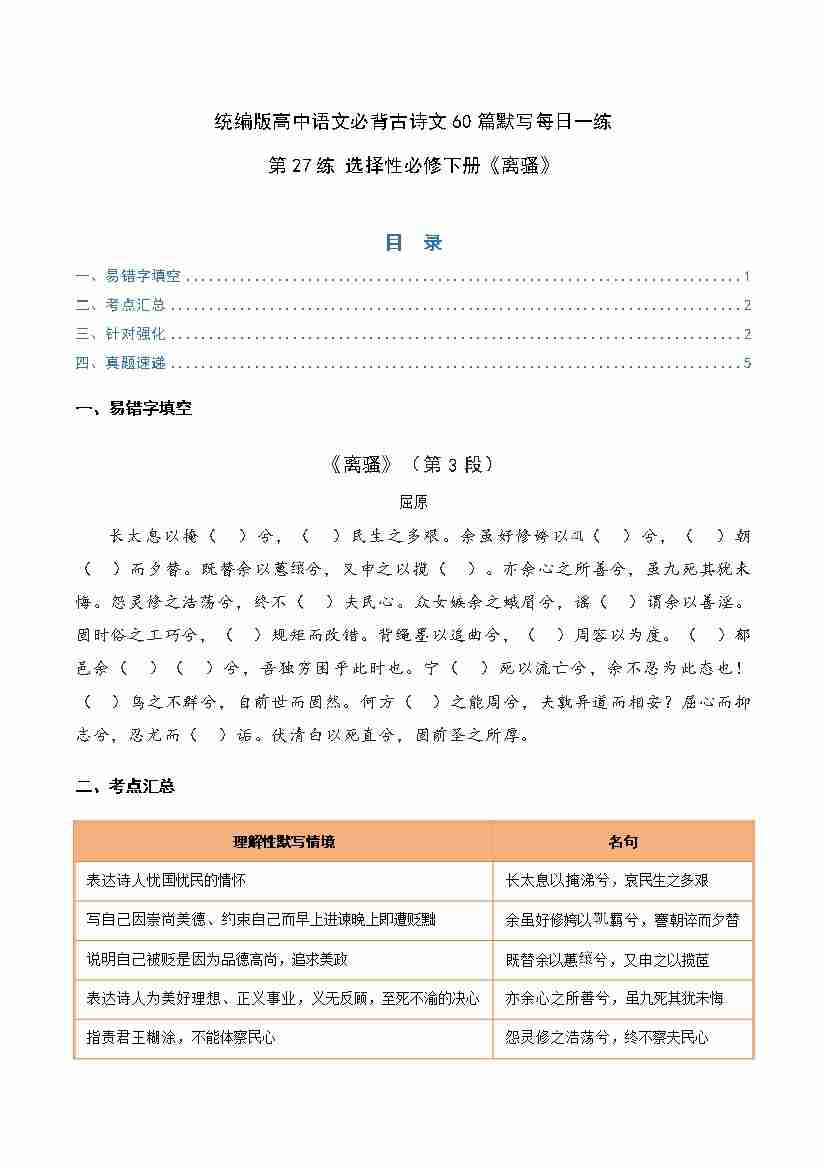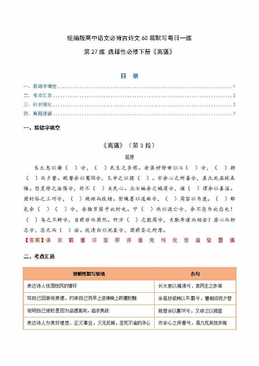 第27练 选择性必修下册《离骚》理解性默写(学生版)