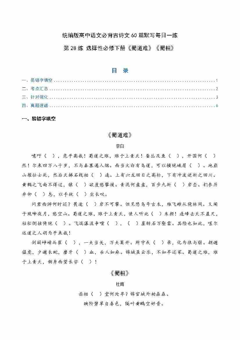 第28练 选择性必修下册《蜀道难》《蜀相》理解性默写(学生版)