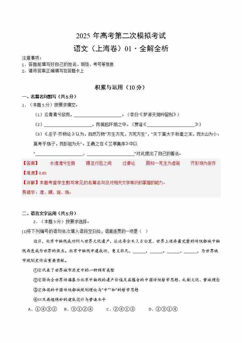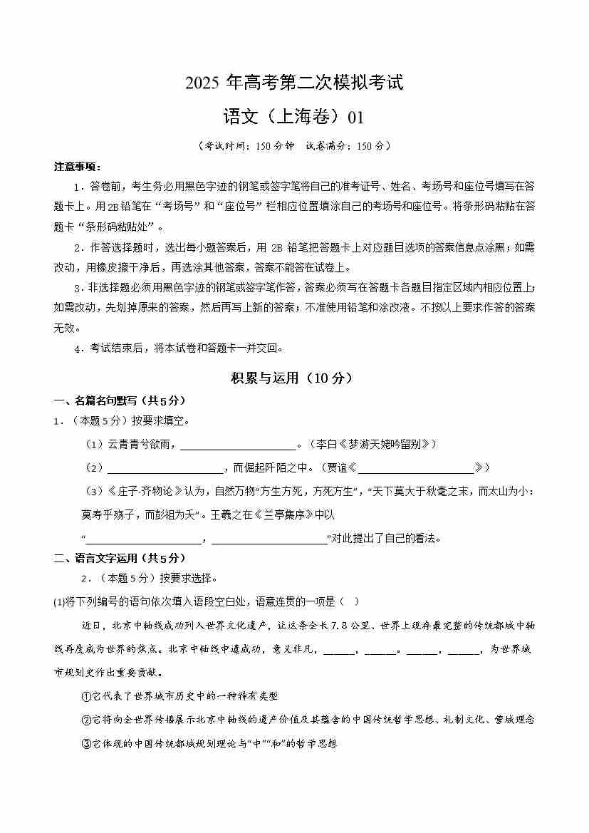 语文01(上海卷)(考试版)