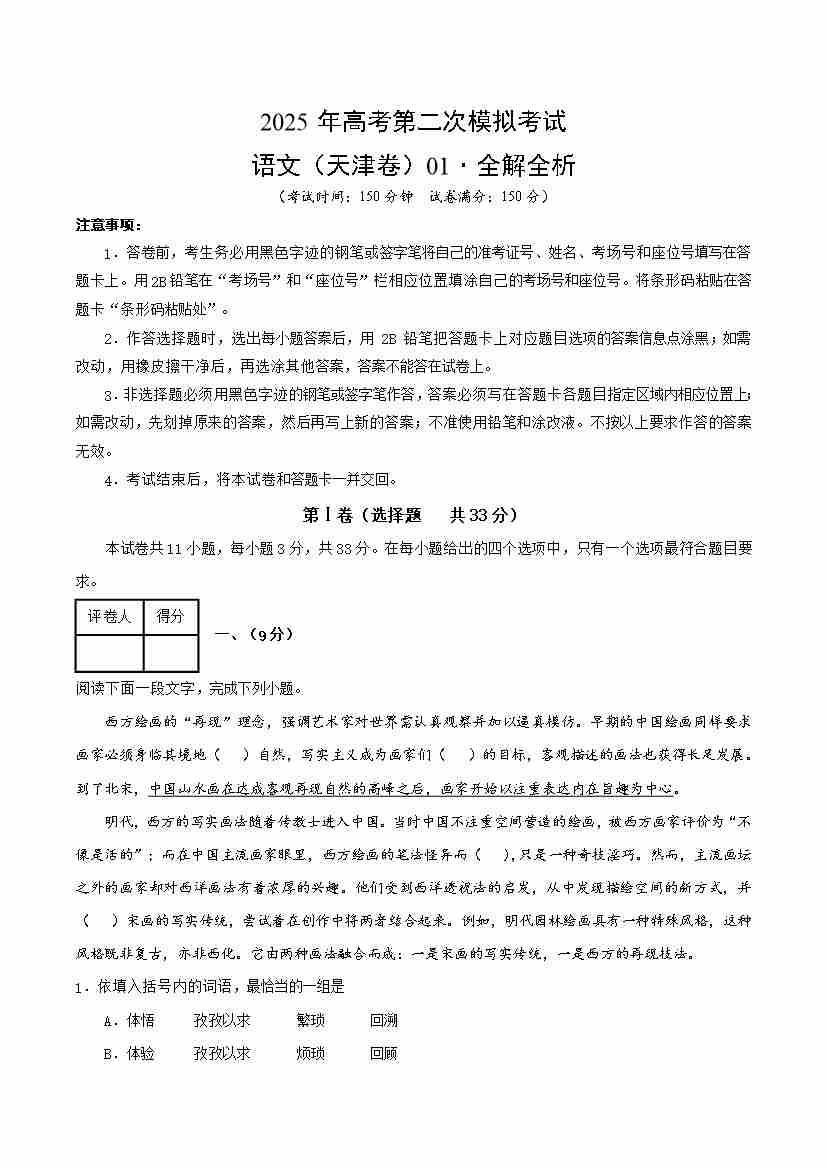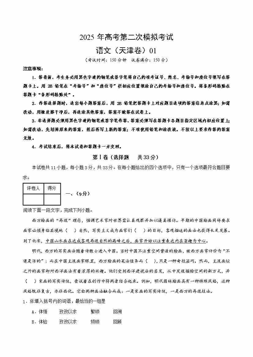 语文01(天津卷)(考试版A4)