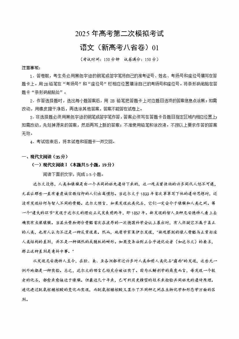 语文(新高考八省卷01)(考试版)