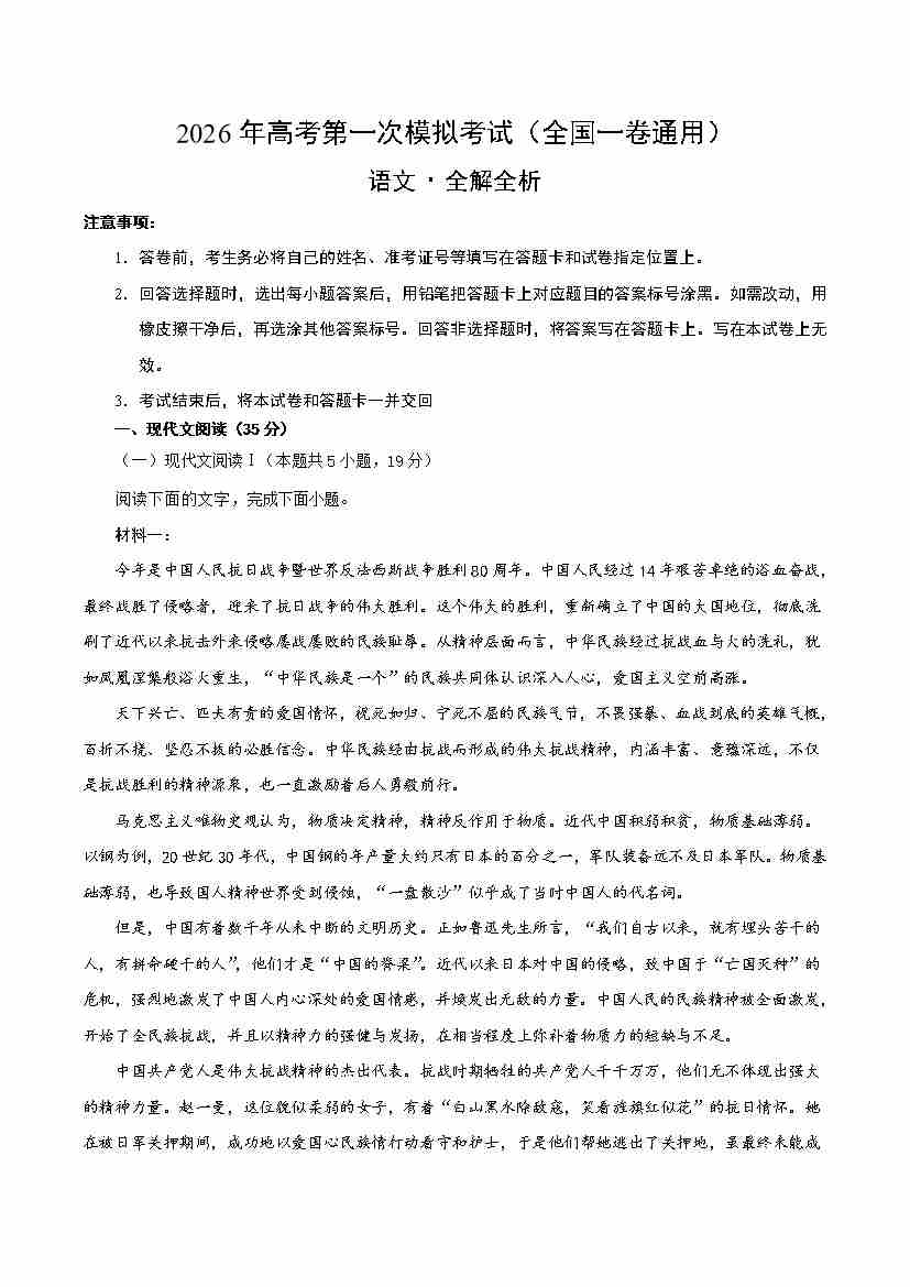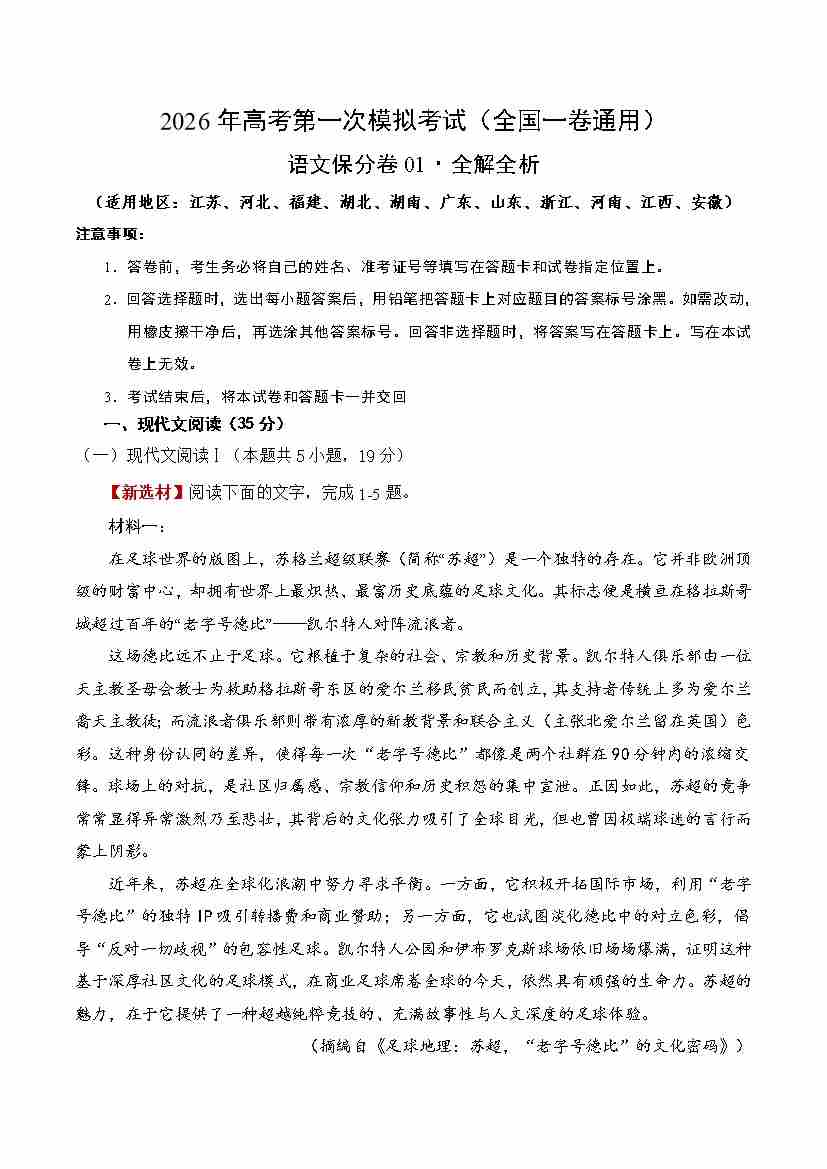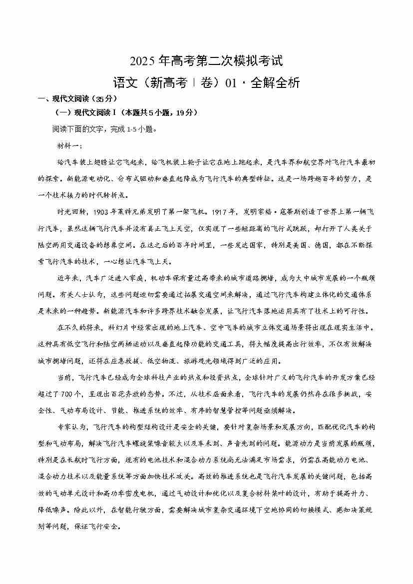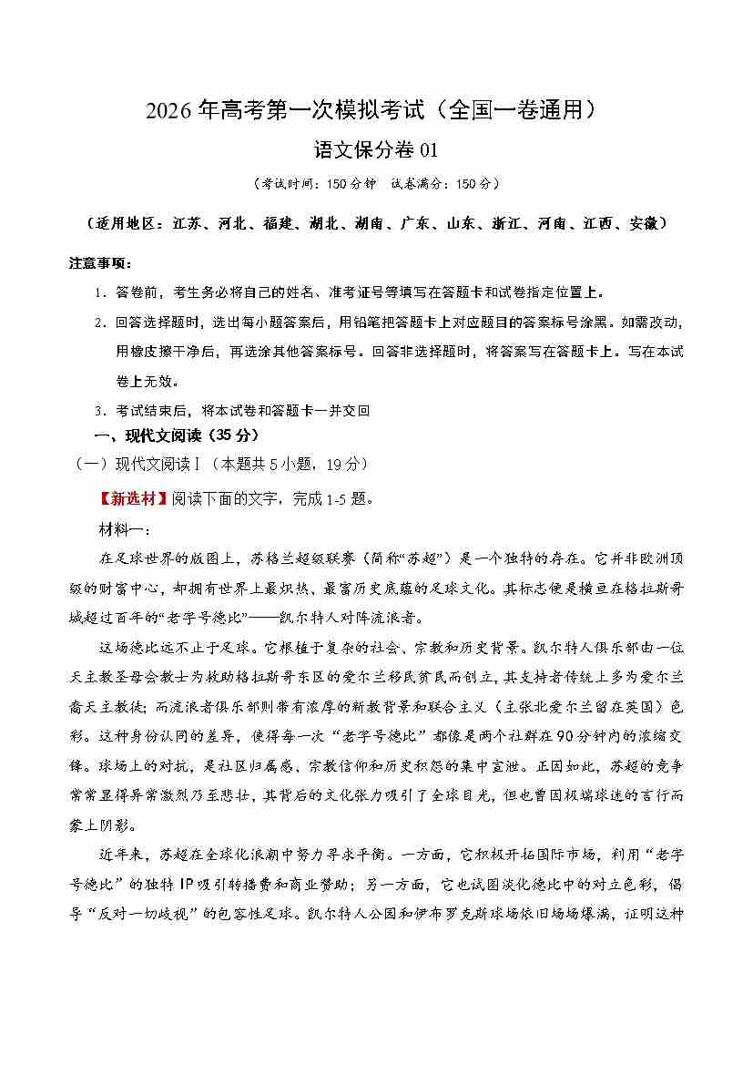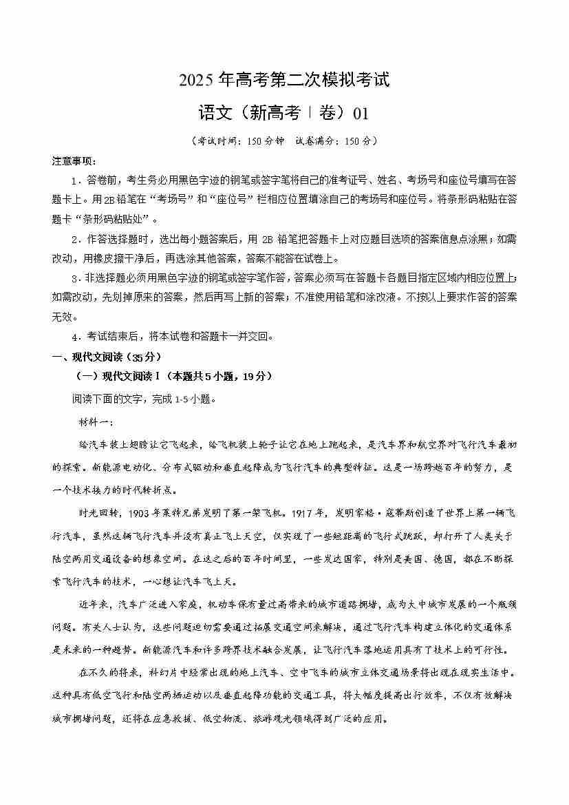 语文一模保分卷01(全国一卷通用)(考试版A4)