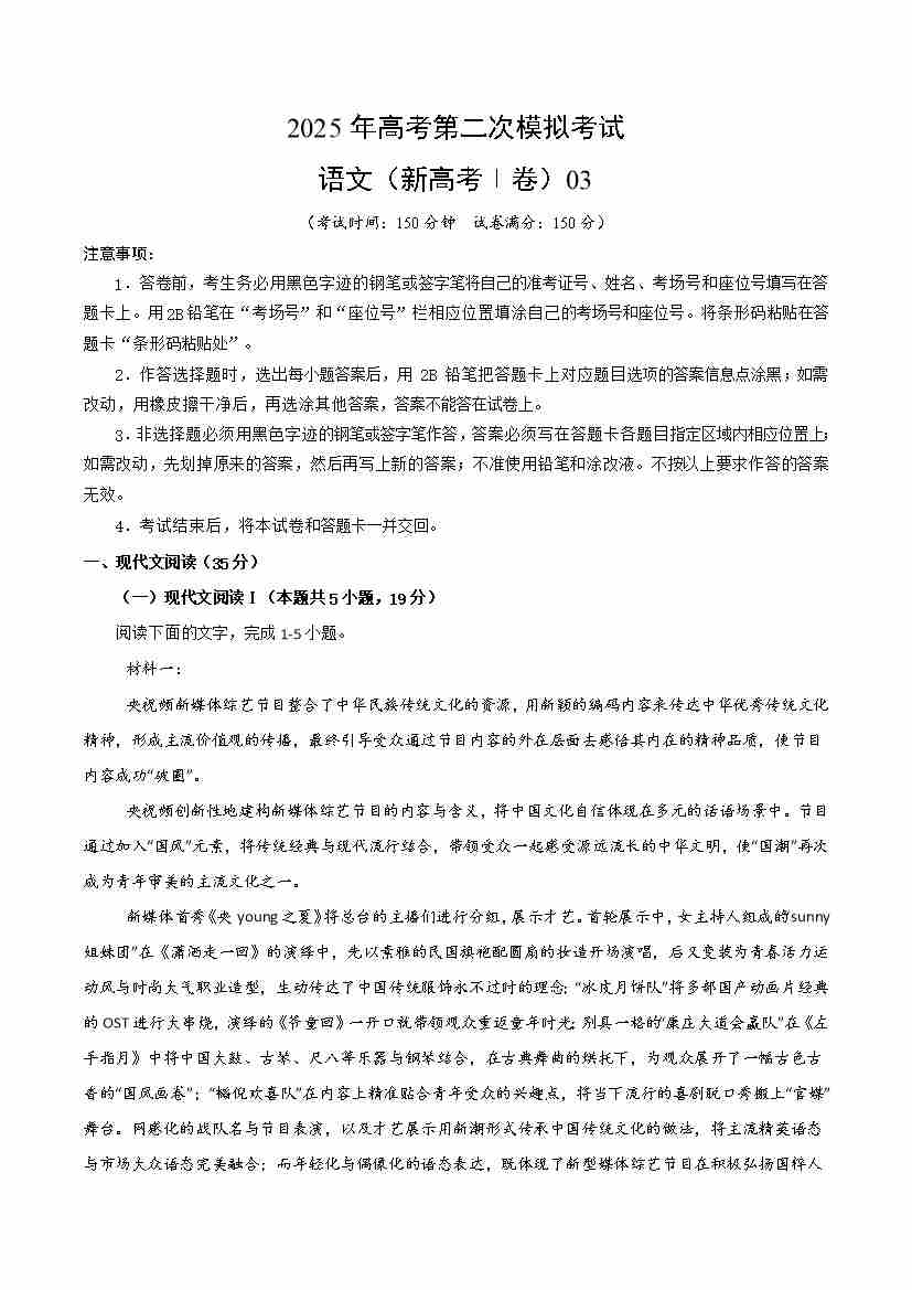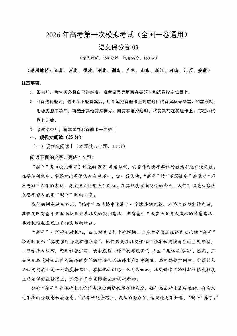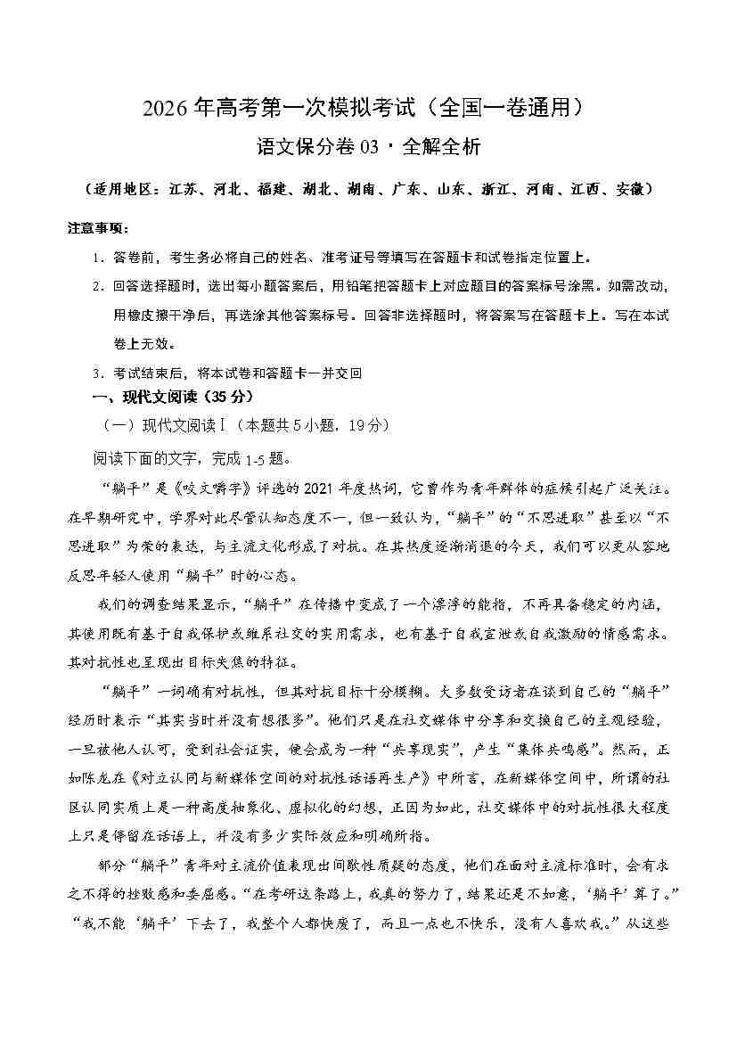 语文一模保分卷03(全国一卷通用)(考试版A4)