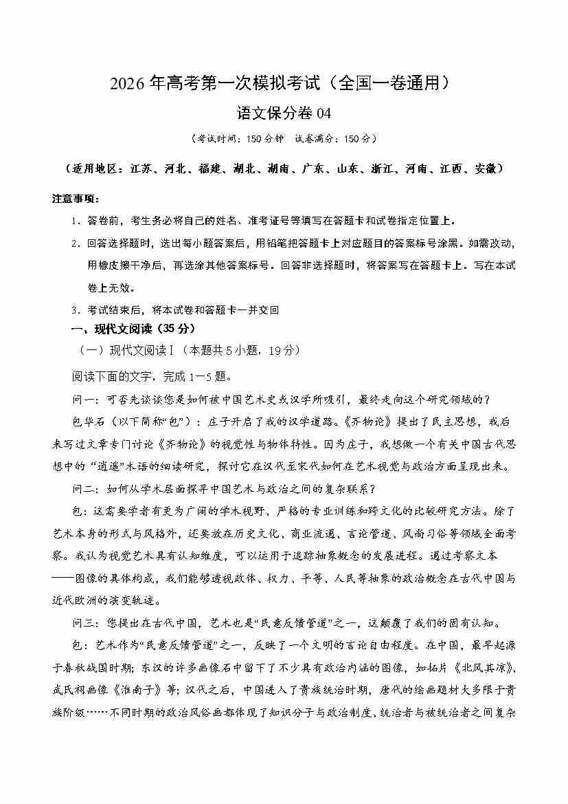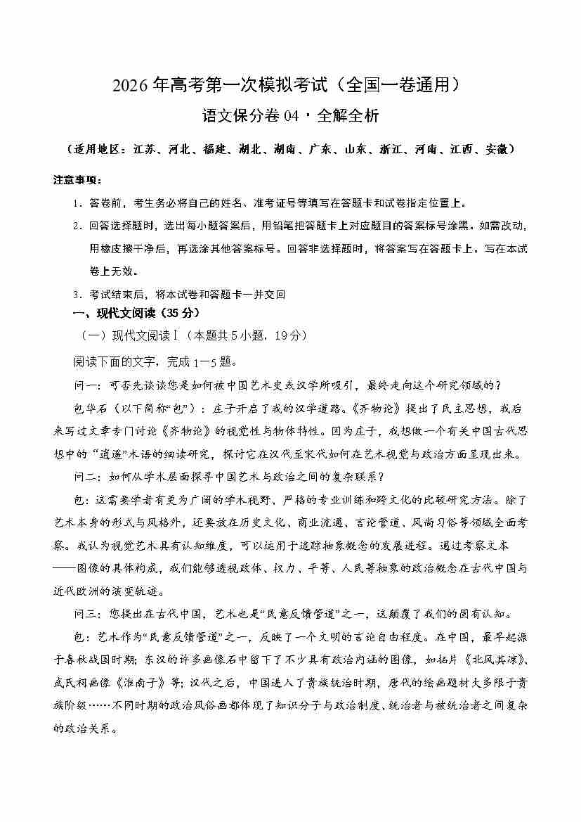 语文一模保分卷04(全国一卷通用)(考试版A4)