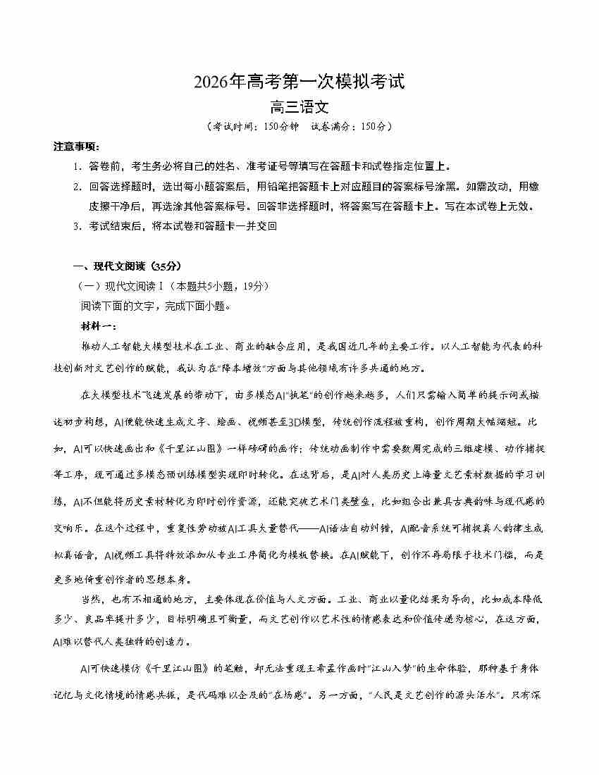 语文一模提分卷01(广东通用)(考试版A4)