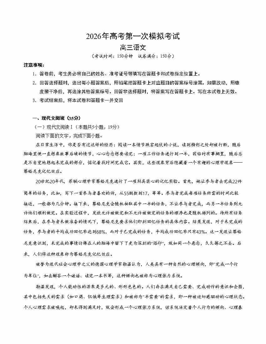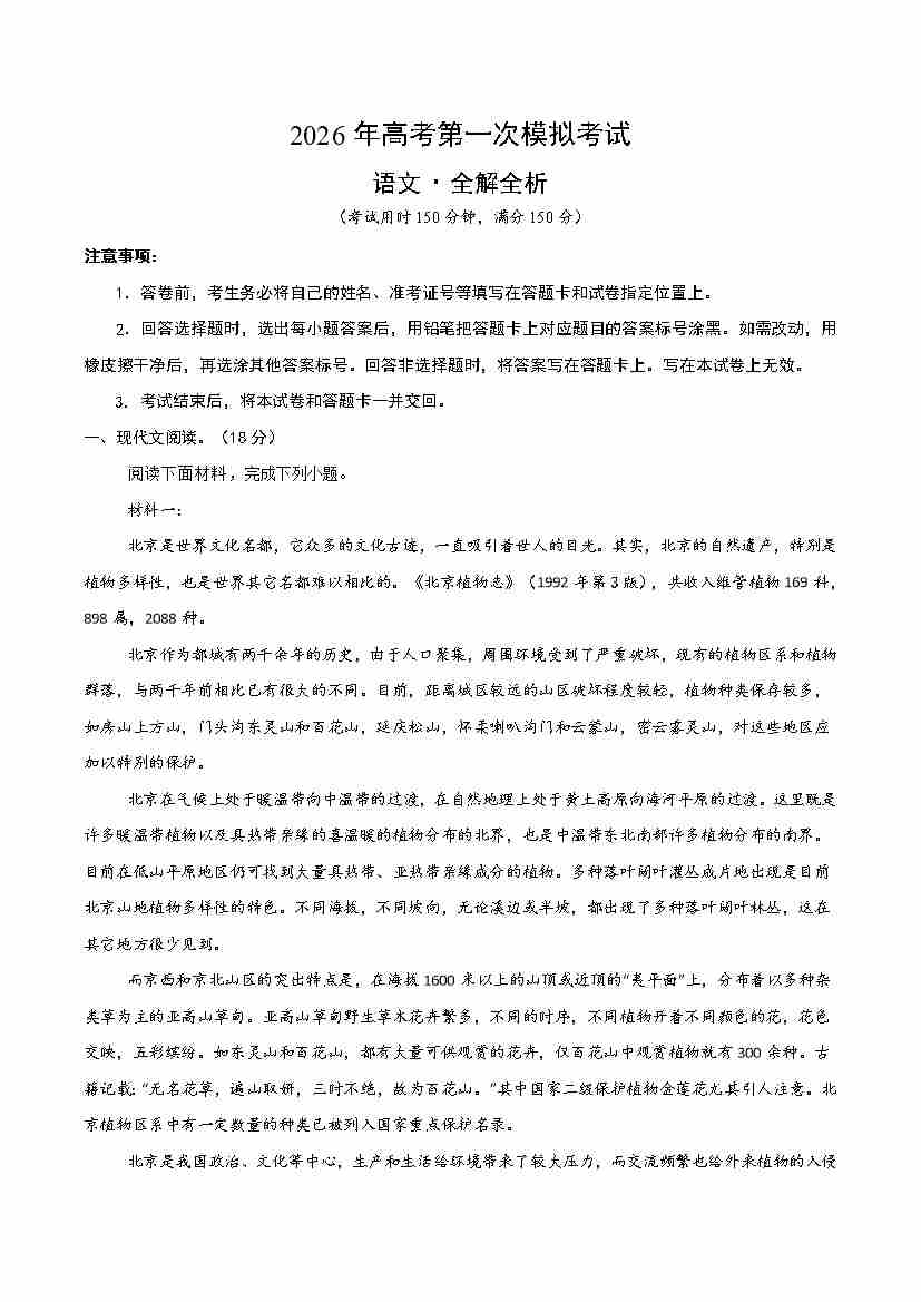 语文一模保分卷01(北京专用)(考试版A4)